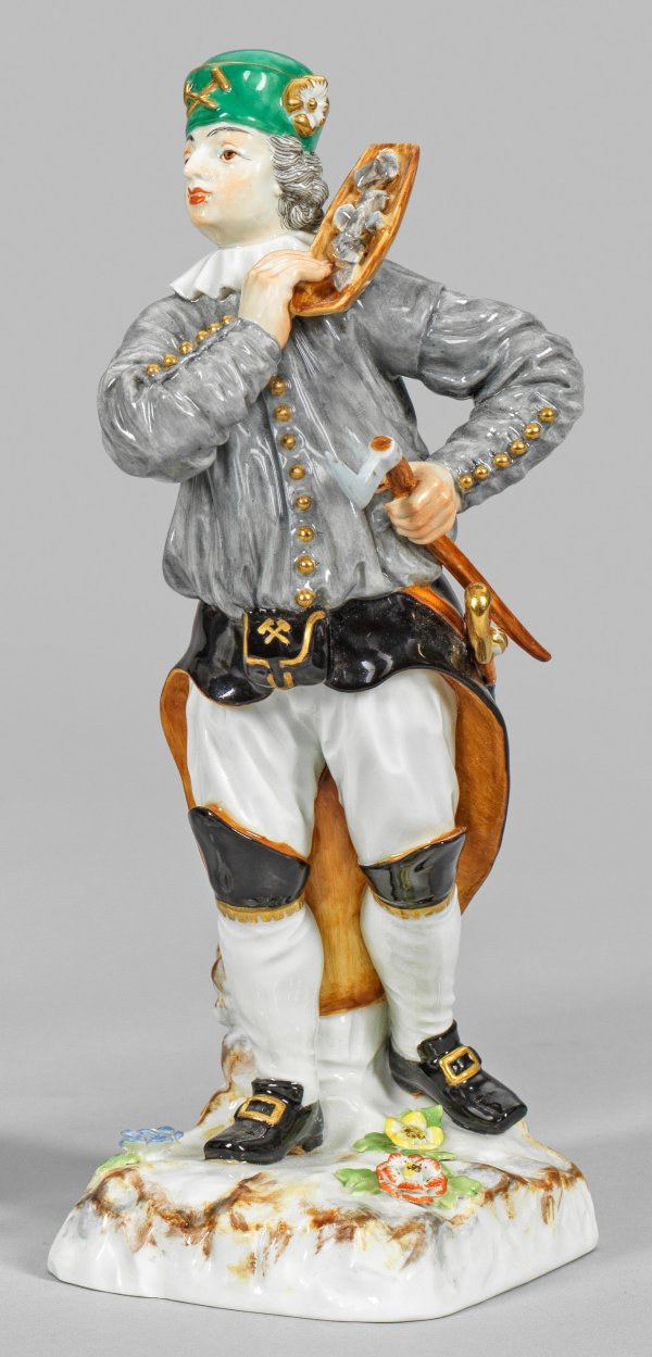 Auf einem blumenbelegten Felssockel stehender Bergmann in berufstypischer Kleidung, in der linken Hand einen Häckel haltend, auf der rechten Schulter eine Mulde tragend. Polychrome Malerei mit Gold. Entw. Johann Joachim Kaendler und Peter Reinicke. Modell-Nr. 69510. Minim. rest.; Schwertermarke. H. 21 cm.