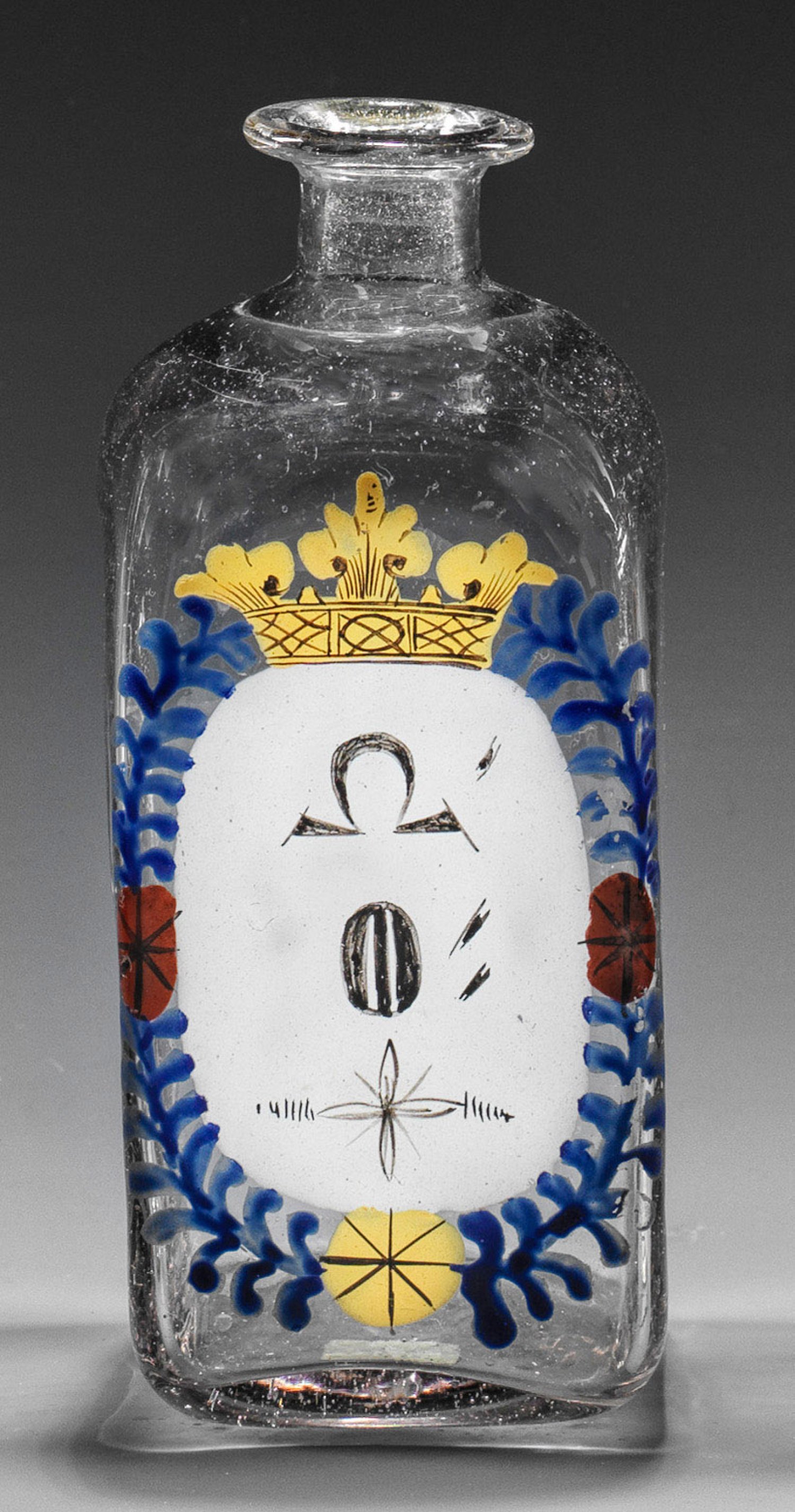 Leicht graustichiges Glas. Vierkantflasche mit quadratischem Querschnitt und gerundeter Schulter. Schauseitig Dekor in farbiger Emailmalerei mit bekrönter, zweigumrahmter, weißer Ovalkartusche und griechischen, schwarzen Buchstaben. Lippenrand rep.; H. 12,5 cm.