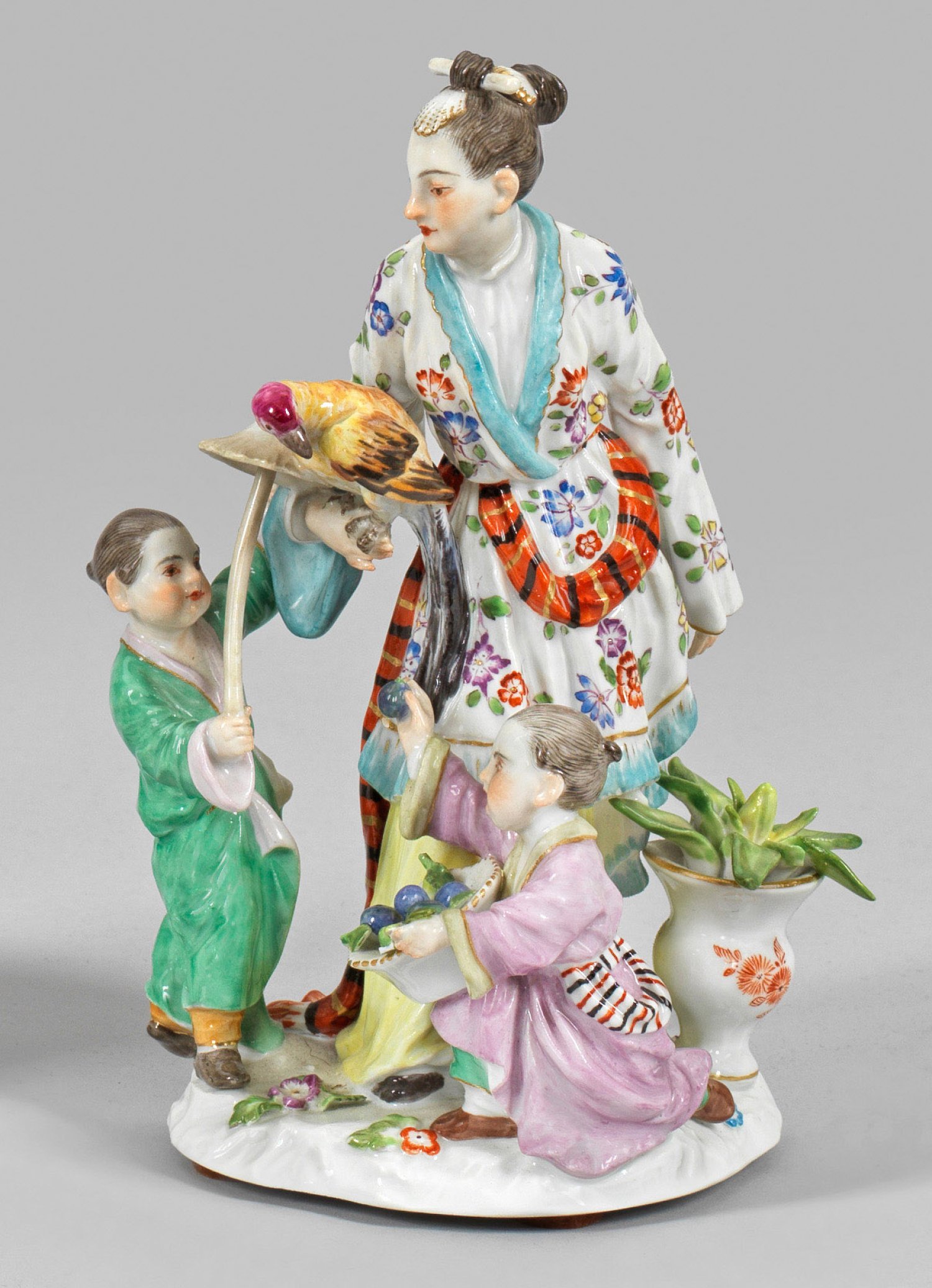 Auf unregelmäßigem Terrainsockel stehende Japanerin, auf ihrer rechten Hand ein Papagei sitzend. Seitlich stehendes Kind mit Schirm sowie kniendes Kind, eine Frucht aus einem Korb darbietend. Polychrome Malerei mit wenig Gold. Entw. Johann Joachim Kaendler. Modell-Nr. 2678. Minim. best.; Schwertermarke. H. 16 cm.