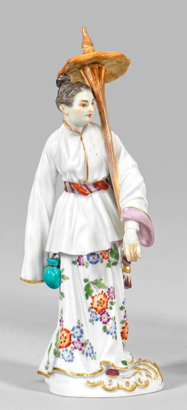 Auf rocaillereliefiertem Sockel stehende Japanerin in weißem Kimono über Untergewand mit Indianischen Blumenmuster, in der linken Hand einen Schirm haltend. Polychrome Malerei mit Goldstaffage. Entw. Johann Joachim Kaendler. Modell-Nr. 65645. Rest.; Schwertermarke. H. 18 cm.