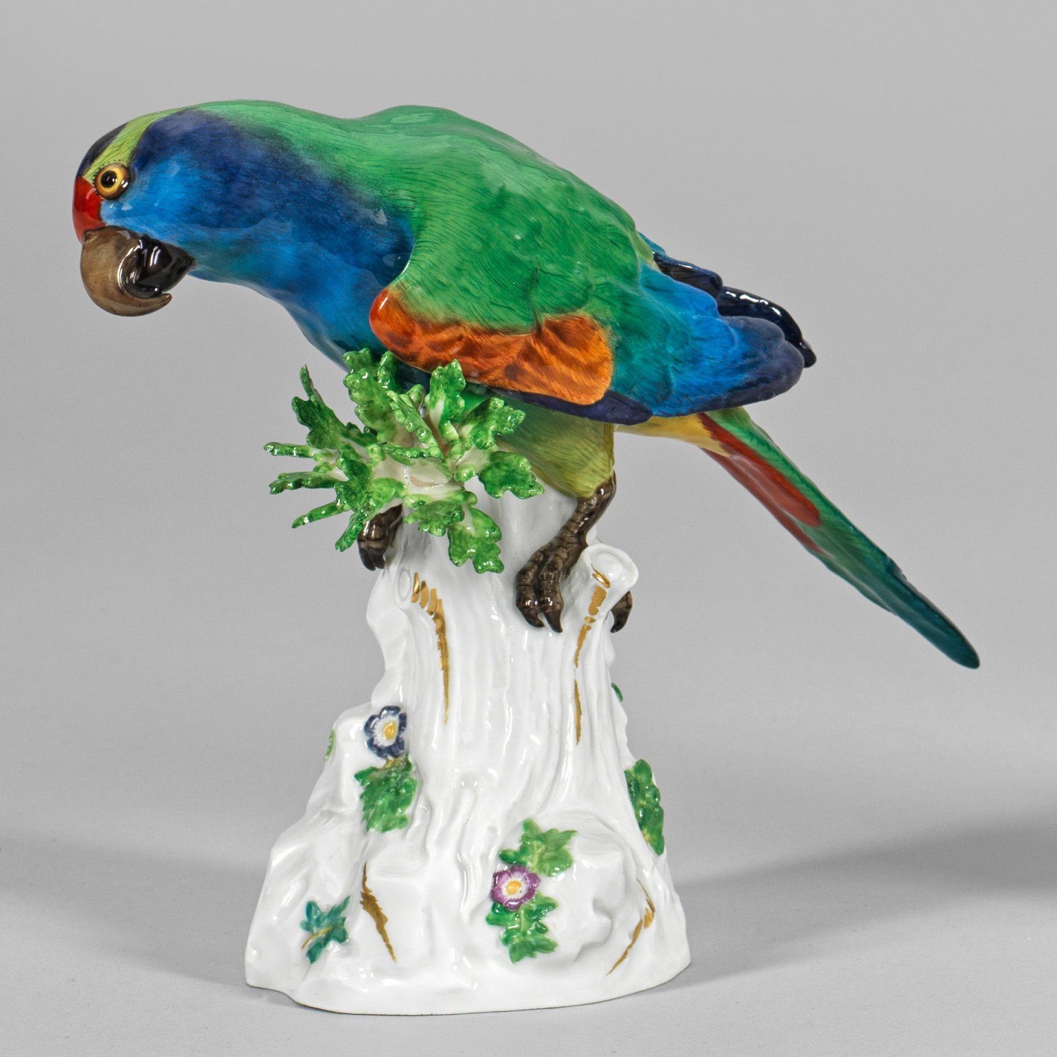 Auf hohem, teilw. mit plastischen Blumen und Blättern belegten, goldakzentuierten Baumstammsockel sitzender Papagei. Reliefiertes, farbenprächtig in unterschiedlichen Grün- und Blautönen staffiertes Gefieder. Polychrome Malerei. Entw. Johann Joachim Kaendler. Modell-Nr. 644b. Unw. rest.; Schwertermarke. H. 19,5 cm.