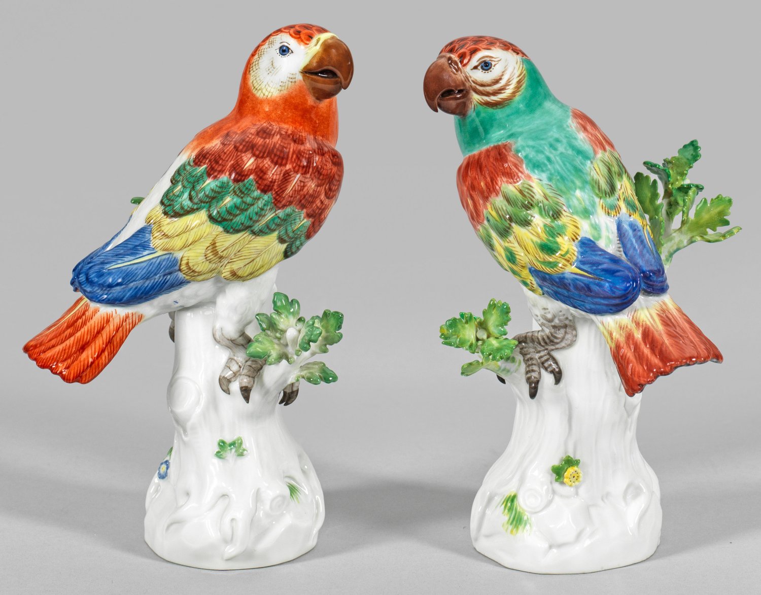 Auf blütenbelegtem Baumstammsockel sitzender Papagei mit fein reliefiertem, farbenprächtig staffiertem Federkleid in naturalistische Ausführung. Polychrome Malerei. Modell-Nr. 77297 und 77298. Unw. rest.; Schwertermarke. H. 15 - 15,5 cm.