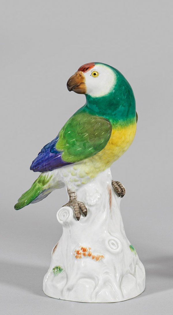 auf Stamm, den Kopf nach rechts gewandt. Reliefiertes, farbenprächtig in unterschiedlichen Grüntönen staffiertes, mit Blau und Rot akzentuiertes Gefieder. Polychrome Malerei. Entw. Johann Joachim Kaendler. Modell-Nr. 59. Schwertermarke. H. 23 cm.