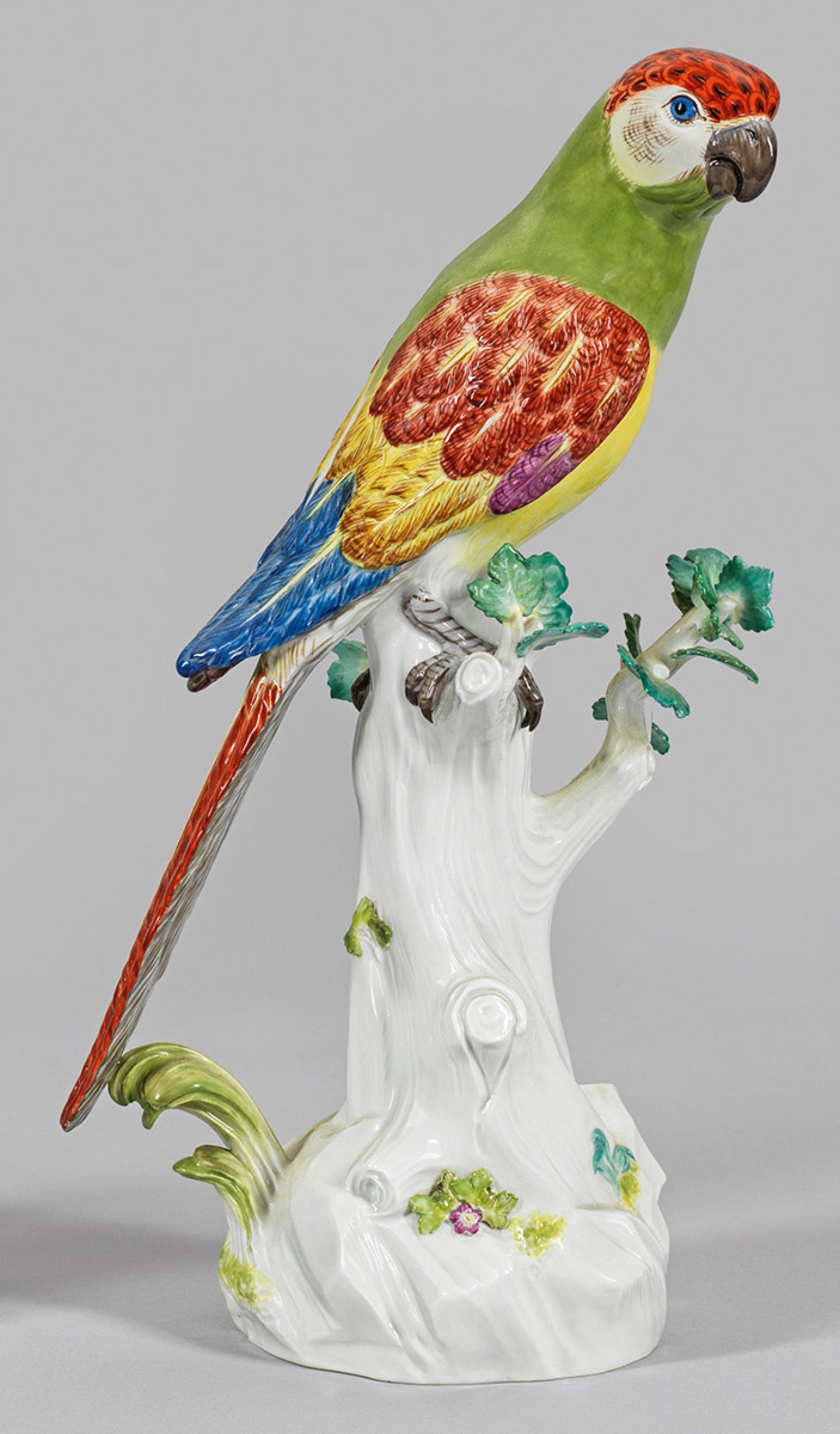 Auf blüten- und blattbelegtem Felssockel emporragender Baumstamm mit Laubwerk. Darauf sitzender Papagei mit fein reliefiertem, farbenprächtig staffiertem Federkleid. Polychrome Malerei. Entw. Johann Joachim Kaendler. Modell-Nr. 77045. Minim. rest.; Schwertermarke. H. 33,5 cm.