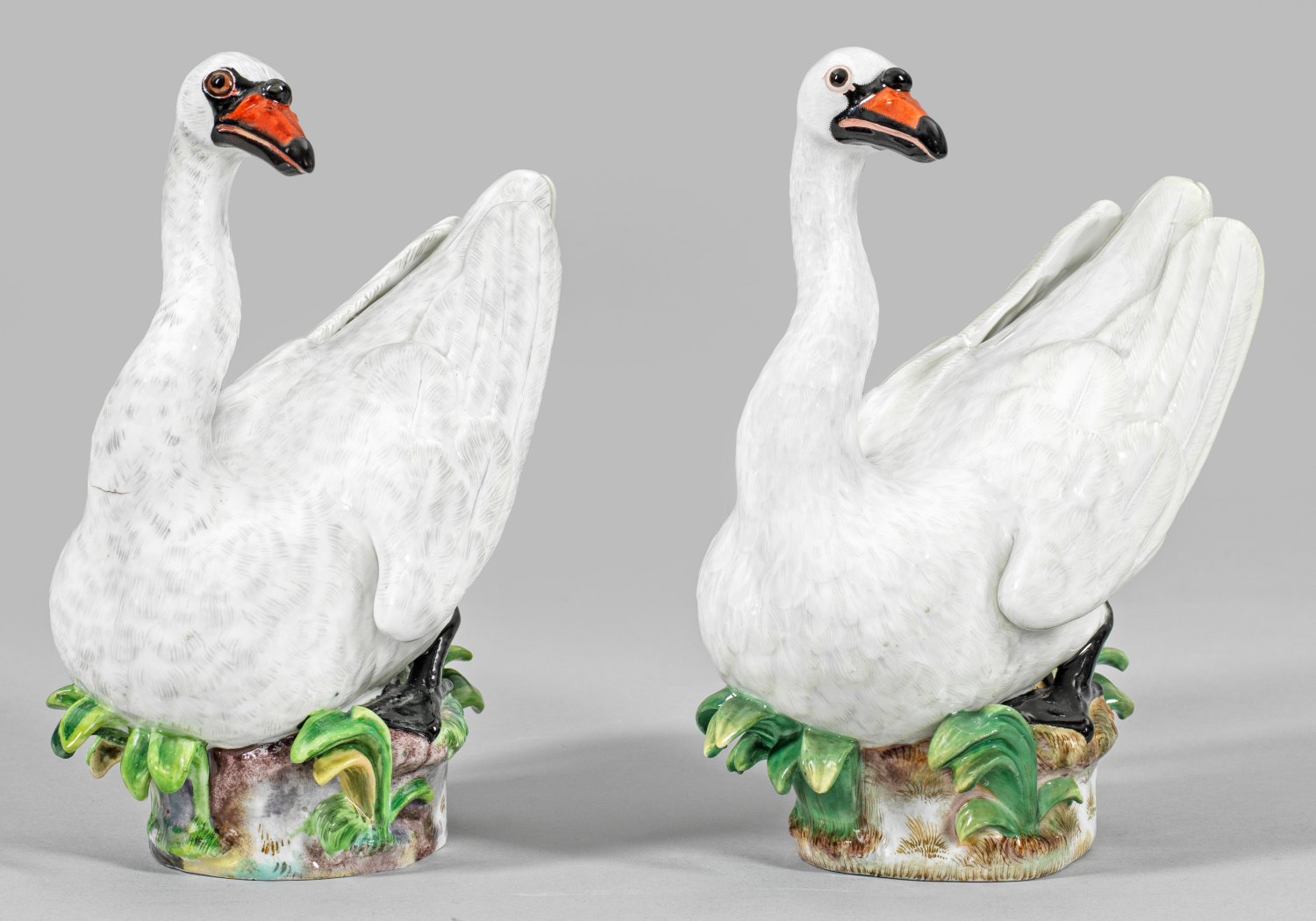 A pair of porcelain swan figures. Partly firing crack. Insignificantly restored. Crossed swords mark.