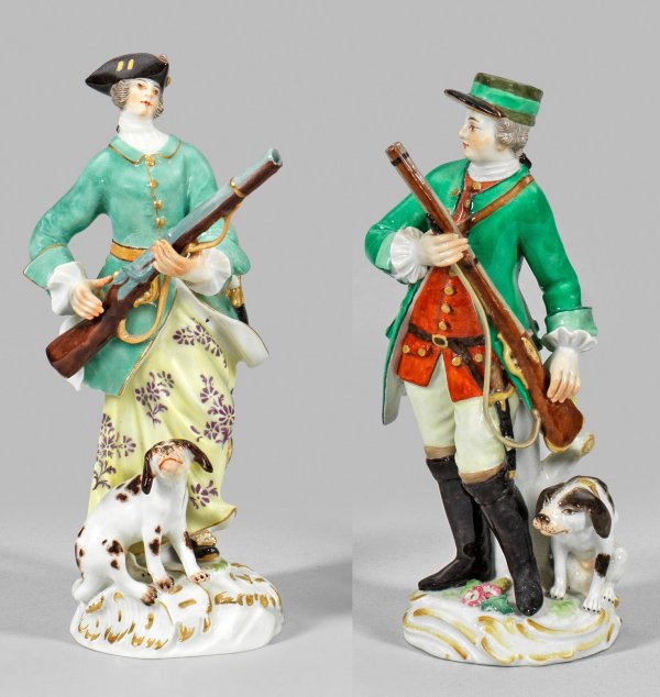Auf rocaillereliefiertem Sockel stehende Jägerin bzw. Jäger, begleitet von einem Hund. In den Händen eine Flinthe haltend. Polychrome Malerei, teilw. mit Goldstaffage. Entw. Friedrich Elias Meyer. Modell-Nr. B74, 1539. Teilw. Jahreszeichen. Unw. rest.; Schwertermarke. H. 13,5 cm.