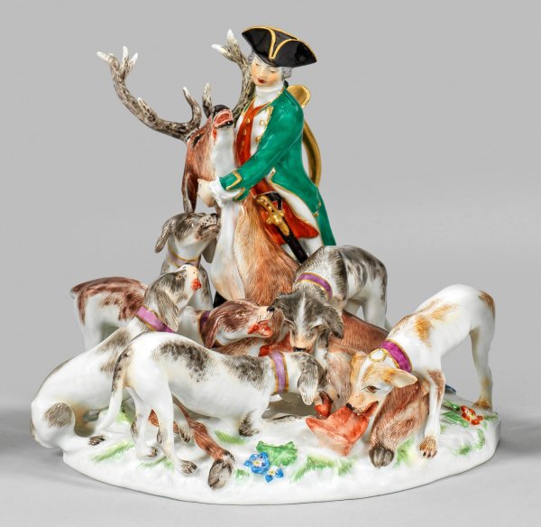 Auf naturalistisch gestaltetem Sockel stehender Jäger mit goldenem Horn, den Kopf eines erlegten Hirschen haltend. Eine Schar von Jagdhunden das liegende Tier umringend. Polychrome Malerei mit Goldstaffage. Entw. Johann Joachim Kaendler. Modell-Nr. 63048. Unw. rest.; Schwertermarke. H. 13 cm. 16 cm x 12 cm.