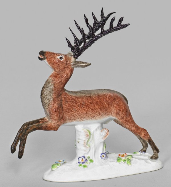 A porcelain figure of a deer. Restored. Crossed swords mark.