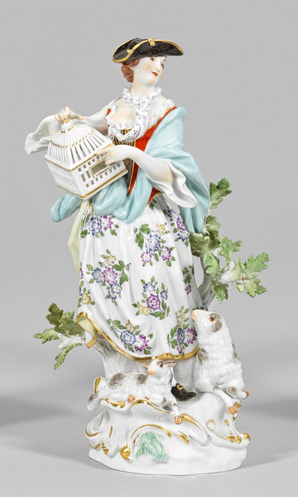 Reliefplastischer Rocaillesockel. An einem Eichenstamm stehende junge Schäferin, einen Vogelkäfig haltend. Zu ihren Füßen ruhende Schafe. Polychrome Malerei mit Goldstaffage. Entw. Johann Joachim Kaendler. Modell-Nr. 61080. Schwertermarke. H. 25,5 cm.