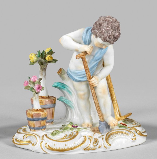 aus der Serie "Vier Elemente". Auf rocaillereliefiertem Sockel, vor Rosentöpfen stehender Knabe beim Umgraben des Erdbodens. Polychrome Malerei mit Goldstaffage. Entw. J. J. Kaendler. Modell-Nr. 70659. Minim. best.; Schwertermarke. H. 11,5 cm.