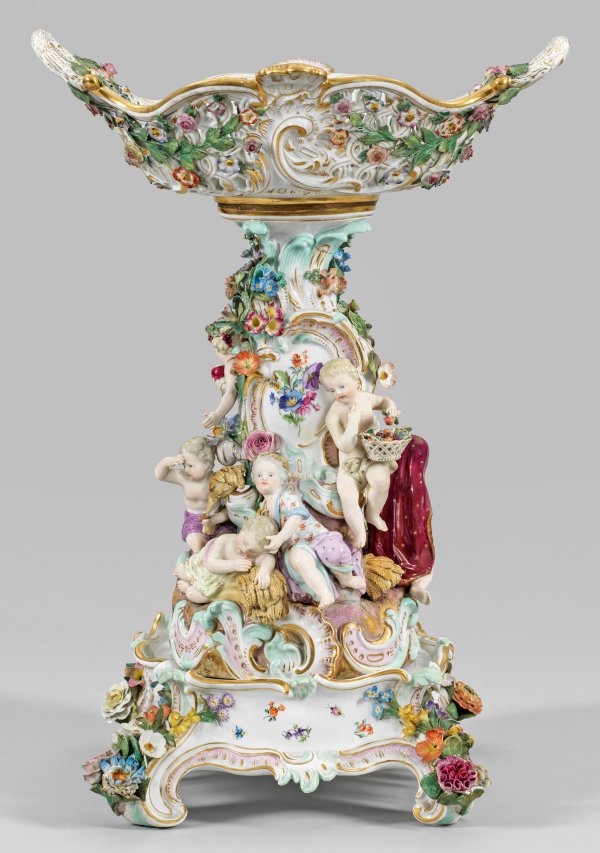 auf quadratischem, von eingerollten Volutenfüßen getragenem Sockel. Über rocaillereliefiertem Rundsockel volutenförmig aufsteigender Schaft als Träger für eine durchbrochen gearbeitete Henkelschale. Umlaufend feinmodellierter, aufgelegter Blütenrankendekor. Unterhalb, auf unterschiedlichen Ebenen, sitzende Amoretten mit entsprechenden Attributen als Frühling, Sommer, Herbst und Winter. Auf den Wandungen, teilw. goldgerahmte Blumengebinde, Streublumen und Insekten. Polychrome Malerei mit reicher Goldstaffage. Modell-Nr. 605. Unw. best.; Minim. rest.; Schwertermarken. Tafelaufsatz-H. 45 cm.