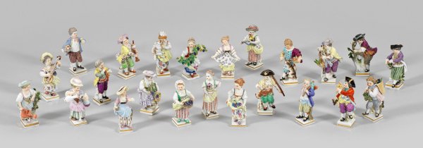 23-tlg.; Auf quadratischem Sockel stehende Mädchen bzw. Knaben in sommerlicher, farbig gemusterter Kleidung u.a. mit Blumenstrauß bzw. Blumentopf, Gießkanne sowie mit Traubenkorb, Weinrebe, Zapfhahn, Weinkiepe als Winzer und mit Flöte, Dudelsack, Gitarre als Musikanten sowie begleitendem Schaf oder Hund. Polychrome Malerei mit Goldstaffage. Entw. Michel Victor Acier, um 1778. Schwertermarke. H. 9 cm - 10,5 cm.