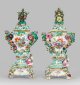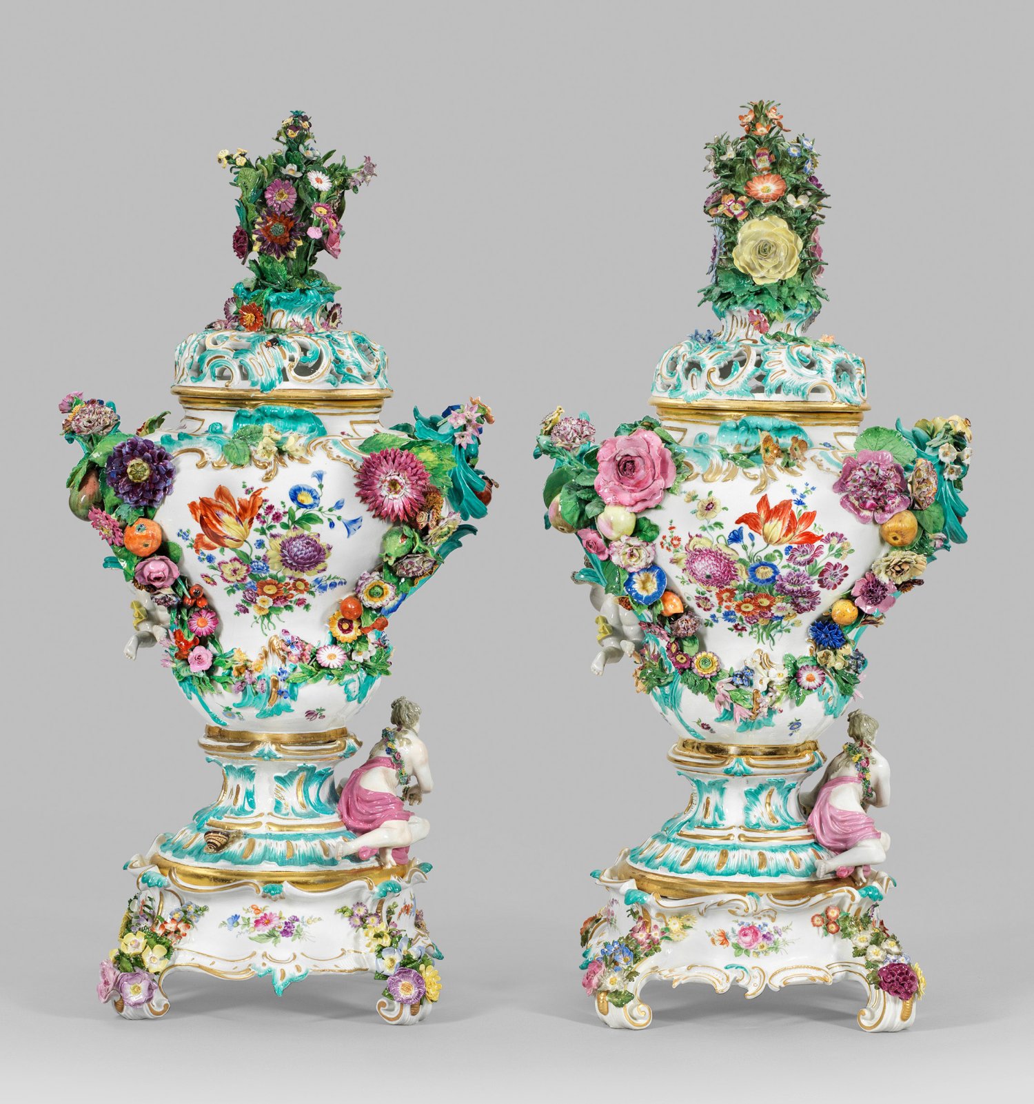 auf quadratischem, von eingerollten Volutenfüßen getragenem Sockel mit plastischem Blumenbelag. Über mehrfach gegliedertem Rundfuß balusterförmiger, stark vorwölbender Vasenkorpus. Seitlich reliefplastisch aufsteigende Palmblätter als Handhaben, Gehöhter, durchbrochen gearbeiteter Deckel, bekrönt von plastischem Blumenarrangement. Allseitig reliefierter Rocailleddekor. Oberhalb schwebender Amorette, unterhalb sitzende, in geblümtem Gewand gekleidete Flora mit gefülltem Blumenkorb. Beidseitig der Wandung, im Inselstil angelegte, szenische Darstellung von galanten, höfischen Watteaufiguren in architekturbestandener Parklandschaft bzw. farbenprächtige Blumenarrangements, umzogen von üppig aufgelegten, fein modellierten Blumenranken über Rocaillewerk. Polychrome Malerei mit reicher Goldstaffage. Entw. Johann Joachim Kaendler. Minim. best.; Rest.; Schwertermarke. Vasen-H. 68 cm. Sockel-H. 13 cm. 31 cm x 31 cm.