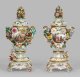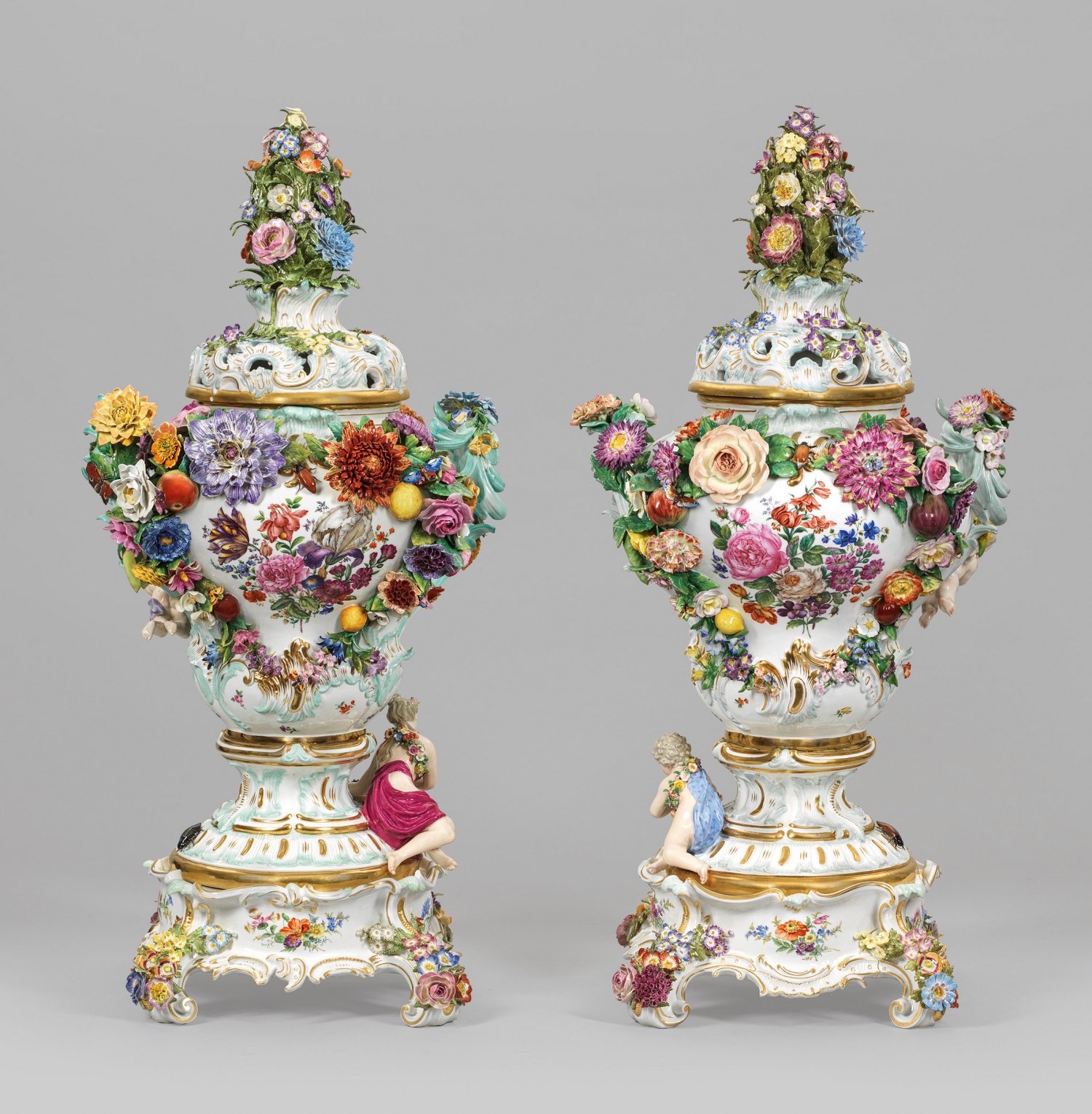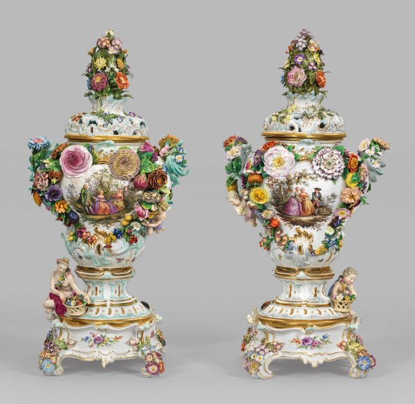 auf quadratischem, von eingerollten Volutenfüßen getragenem Sockel. Über getrepptem, rocaillereliefiertem Rundfuß balusterförmiger, stark vorwölbender Vasenkorpus mit gerundeter Schulter und profiliertem Rand. Gehöhter, von Rocaillereliefs umzogener, durchbrochen gearbeiteter Deckel, in reliefplastische Blätter übergehend, als Basis für ein prächtiges Blumenbukett aus verschiedenen, äußerst feinplastisch modellierten, geöffneten Blüten. Seitlich reliefplastisch aufsteigende Palmblätter als Handhaben. Feinplastisch modellierter, aufgelegter Dekor mit üppigen Festonen aus sommerlichen Blüten und Früchten sowie Insekten. Unterhalb sitzende Flora bzw. Amorette mit gefülltem Blumenkorb und Girlande. Oberhalb jeweils schwebende Amorette. Beidseitig der Wandung, zwischen farbigem Streublumendekor angelegte, großflächige, szenische Darstellung in der Art von Antoine Watteau mit zwei vornehmen, jungen Damen in Gesellschaft eines Kavaliers in teilw. architekturbestandener Parklandschaft bzw. farbenfrohes Blumenarrangement. Feine polychrome Malerei mit reicher Goldstaffage. Entw. Johann Joachim Kaendler. Minim. best.; Rest.; Schwertermarke. Ges.-H. ca. 87 cm. Vasen-H. 73 cm.