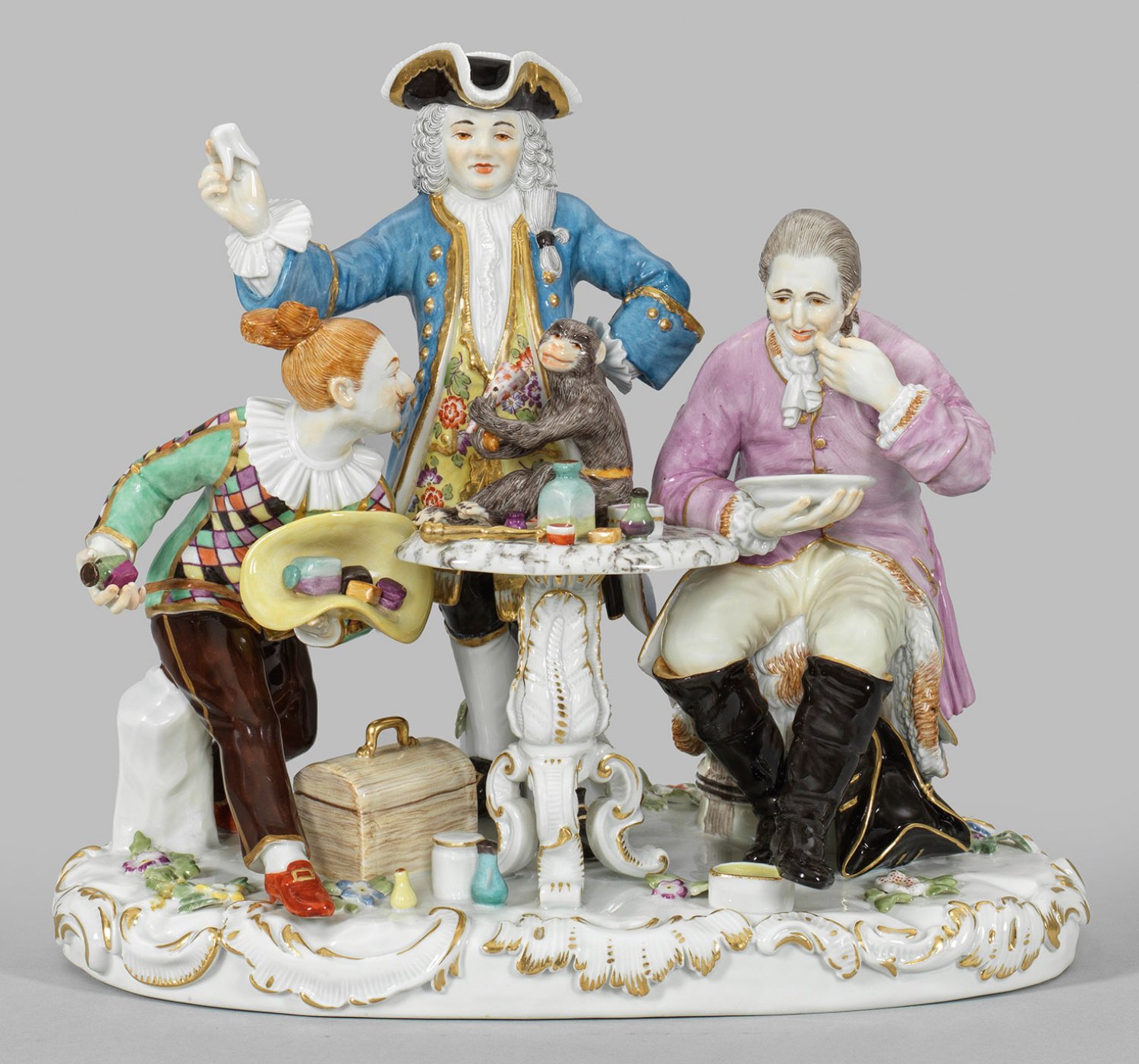 Rocaillereliefierter, ovaler, mit plastischen Blumen belegter Sockel. Mittig stehender Rokokotisch mit sitzendem, einen Zuckerhut haltenden Affen sowie diversen Arzneifläschchen, Döschen und einem Zuckerhammer. Dahinter ein edel gekleideter Zahnarzt in blauem, goldakzentuiertem Rock über gelbfarbener, von Indianischen Blumen gemusterter Weste und weißem Hemd, über der Allongeperücke einen schwarzen Dreizack tragend. Die linke Hand in die Hüfte stützend, die erhobene Rechte hält den gezogenen Zahn. Flankierend sitzender Patient in rosafarbener Jacke, heller Hose und schwarzen Stulpenstiefeln bzw. stehender Harlekin im gemusterten Komödiantenkostüm mit gelbem Hut sowie weiteren Dosen und Flakons. Am Boden stehender Arztkoffer und Utensilien. Polychrome Malerei mit reicher Goldstaffage. Entw. Johann Joachim Kaendler. Modell-Nr. 73012. Schwertermarke. H. 21 cm. 24 cm x 15 cm.