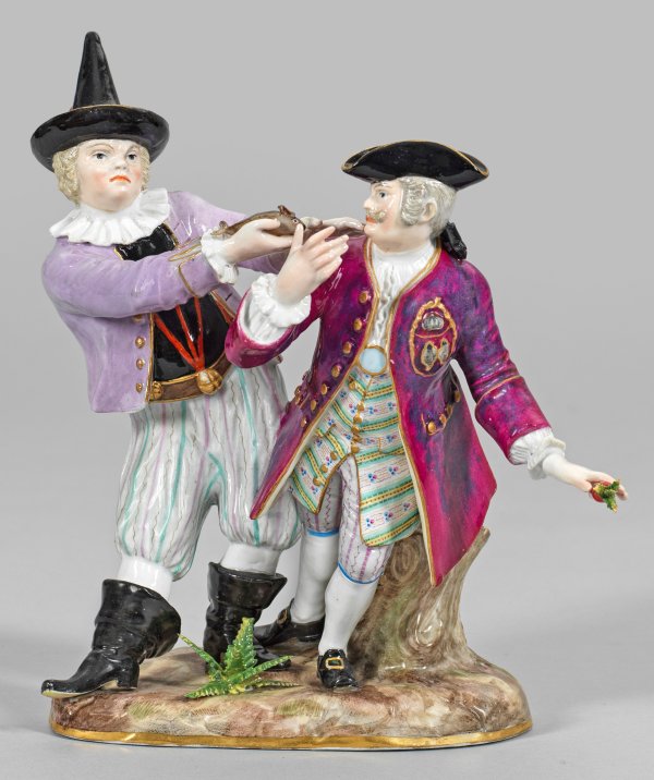 Auf naturalistisch gestaltetem Sockel stehender Hofnarr Fröhlich in farbigem Kostüm mit schwarzem Spitzhut und weißer Halskrause, in der rechten Hand eine Maus haltend, die er seinem gleichfalls kostümierten, zurückweichenden Mitstreiter, dem Hofnarr Schmiedel, darbietet. Polychrome Malerei mit Goldstaffage. Rest.; Schwertermarke. H. 24 cm.