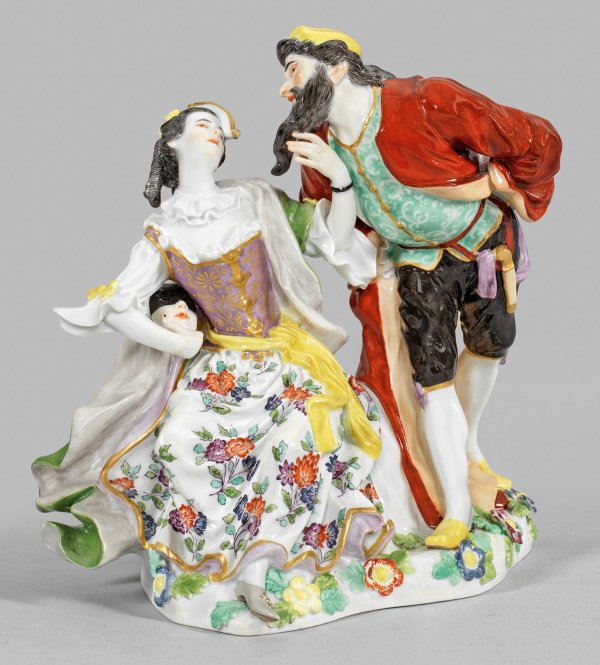 aus der Italienischen Komödie. Auf einem mit plastischen Blüten und Blättern belegtem Sockel sitzendes Paar. Columbine im grünen Umhang, fliederfarbenem, goldgeblümtem Mieder über weißer Bluse und einem, von Indianischen Blumen gemustertem Rock, mit der linken Hand den langen Bart des seitlich stehenden Pantalone berührend. Die rechte Hand mit einer Maske versteckt sie hinter ihrem Rücken. Polychrome Malerei. Entw. Johann Joachim Kaendler. Modell-Nr. 279. Minim. rest.; Schwertermarke. H. 16 cm.