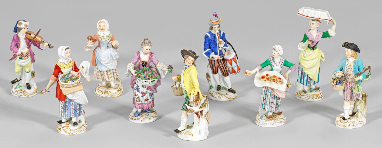 (Pariser Ausrufer). Auf rocaillereliefiertem Sockel stehende Obst- und Blumenhändlerinnen, Muschel- und Gebäckverkäuferin sowie stehender Geigenspieler, Geflügel- und Traubenhändler und Trommler. Polychrome Malerei mit Goldstaffage. Entw. Johann Joachim Kaendler. Modell-Nr. 60224, 60231, 60237, 60238, 4, 7, 13, 16, 28. Teilw. rest./minim. best.; Schwertermarke. H. 13,5 - 14 cm.