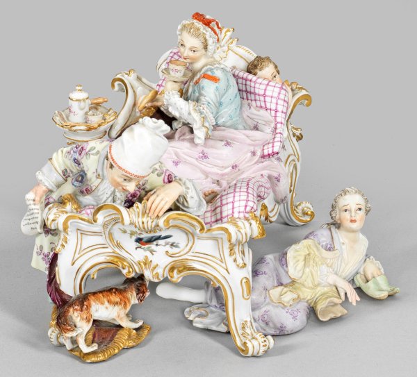 2-tlg.; In einem prunkvollen, rocaillereliefiertem Rokoko-Bett sitzende Dame mit einer Tasse Kakao und Gebäck, an dessen Fußende der Ehegatte, den auf dem Boden davonschleichenden jungen Liebhaber entdeckend. Am Bettende, hinter kariertem Bettlaken versteckter Amor mit Pfeil und Bogen. Polychrome Malerei mit Goldstaffage. Entw. Johann Joachim Kaendler. Modell-Nr. D 64. Minim. best./Haarrisse. Rest.; Schwertermarken. H. 5 cm - 12 cm. 6 cm - 20 cm x 12 cm - 13 cm.