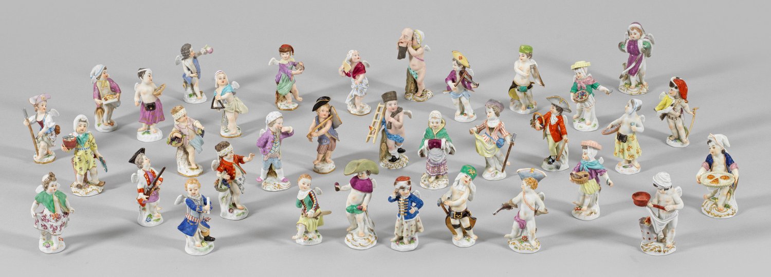 34-tlg.; Auf rocaillereliefiertem Sockel stehende Amorettenknaben und -mädchen, verkleidet u. a. als Harlekinette (Columbine) mit Pritsche, Husaren, Bäcker, Pilger, Bergmannsknabe, Bergmannsmädchen, Offizier, Hirten, Fischverkäuferin bzw. in Herrschertracht, mit Maske, Geige, Triangel. Polychrome Malerei mit Goldstaffage. Entw. Michel Victor Acier, um 1775. Teilw. unw. rest./rep.; Schwertermarke. H. 9 cm - 10,5 cm.