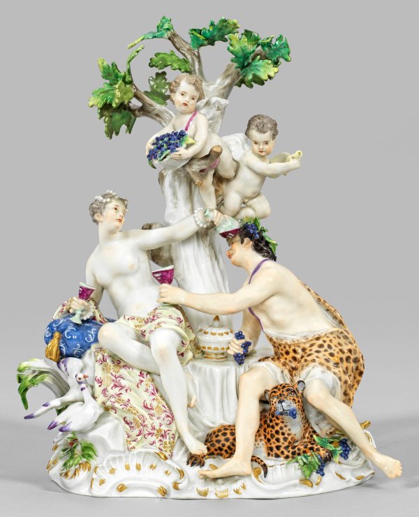 Auf Rocaillesockel unter einem Eichenbaum sitzende Göttin Venus im blütengemusterten Tuch in Begleitung des weinbekränzten Bacchus im Leopardenfell. Zu ihren Füßen eine schnäbelndes Taubenpaar sowie ein liegender Leopard. Oberhalb zwei schwebende Amoretten mit Traubenkorb und Weinflasche. Polychrome Malerei mit Goldstaffage. Entw. Friedrich Elias Meyer, um 1756. Modell-Nr. 2425. Best./Unw. rest.; Schwertermarke. H. 25 cm.