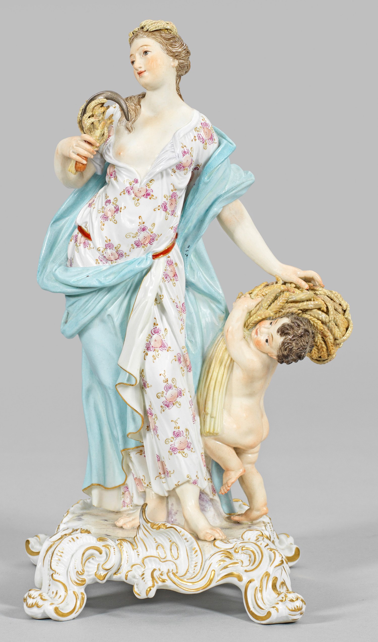 aus der Serie "Vier Jahreszeiten". Auf quadratischem, von vier Volutenfüßen getragenem Rocaillesockel stehende junge, antikisierende Frau in geblümtem Gewand mit blauem Überwurf, begleitet von einem Putto mit Sichel bzw. Ährenbündel als Allegorie des Sommers. Polychrome Malerei mit reicher Goldstaffage. Entw. Johann Friedrich Eberlein. Unw. rest.; Schwertermarke. H. 28 cm.