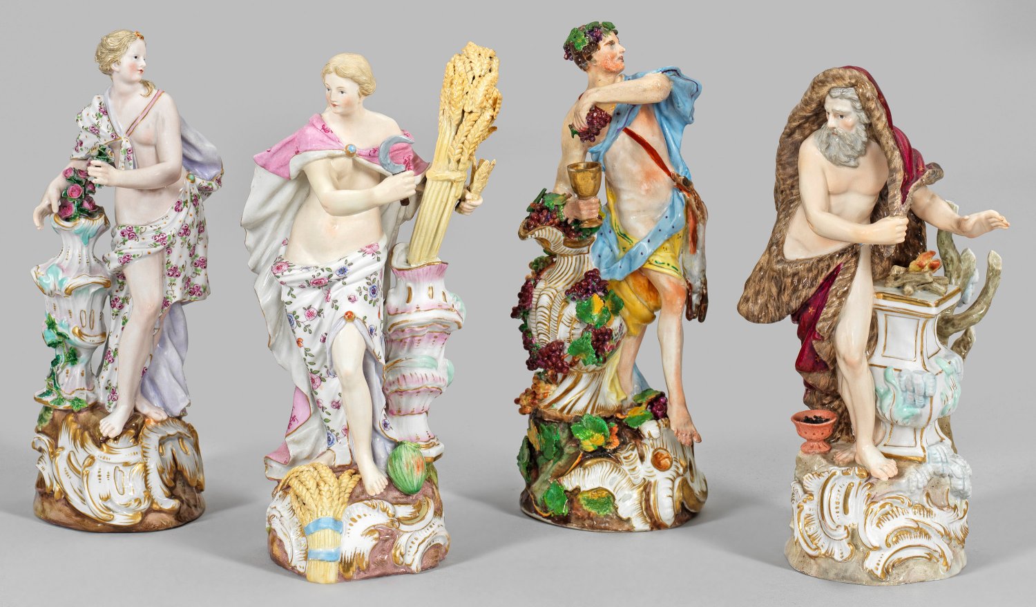 4-tlg.; Auf gehöhtem Rocaillesockel stehende, antikisierende, weibliche Personifikationen in geblümten Gewändern mit Blumen, Ährenbündel und Sichel als Frühling und Sommer. Als Gegenstücke der weinbekränzte Bacchus mit Weinpokal sowie der am lodernden Feuer stehende, alte bärtige Mann mit pelzgefüttertem Mantel, den Herbst bzw. den Winter repräsentierend. Polychrome Malerei mit Goldstaffage. Entw. Friedrich Elias Meyer. Modell-Nr. 2730, 2724 (Frühling, Sommer). Winter mit Presszeichen. Teilw. Brandrisse. Rest.; Unw. best.; Schwertermarke. H. 22 cm - 23 cm.