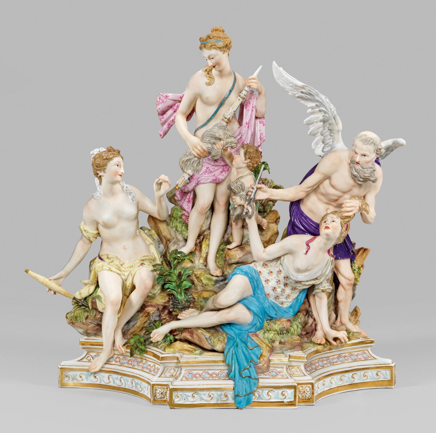 2-tlg., verschraubt. In der Front architektonischer, verkröpfter Sockel mit reliefierten Ornamentfriesen. Über Felsterrain komponierte Gruppe der drei römischen Schicksalsgöttinnen, der sog. Parzen. Mittig erhöht stehende, von einem Putto mit Wollbündel begleitete Clotho, zusammen mit der links sitzenden Lachesis, die Lebensfäden der Menschen spinnend. Rechts stehender Chronos, der Gott der Zeit, die vor ihm liegende Atropos an den Haaren zurückhaltend, um sie am Abschneiden des Fadens zu hindern. Polychrome Malerei mit reicher Goldstaffage. Entw. Johann Joachim Kaendler, 1774. Modell-Nr. 33. Unw. rest.; Schwertermarke. H. 37 cm. B. 35 cm.