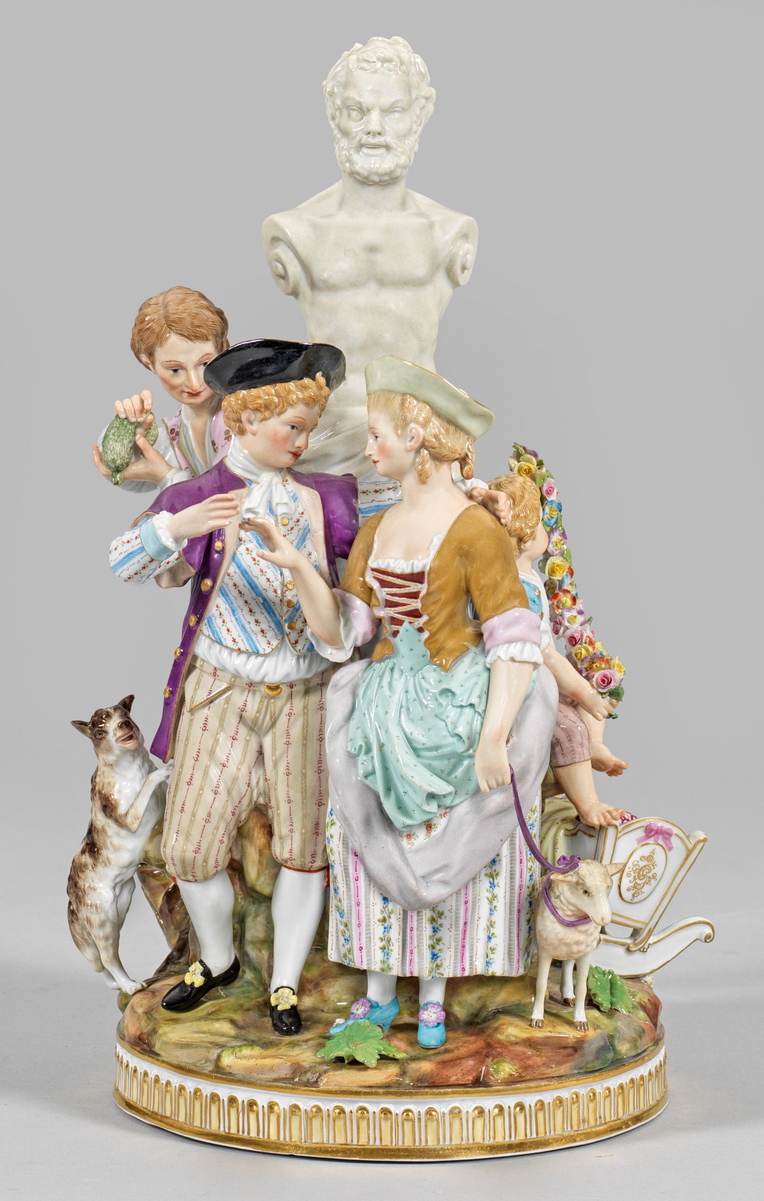 auch genannt "La fiancée Villageoise" (Die Dorfbraut). Auf reliefornamentiertem Rundsockel allansichtige Gruppe. Vor einer Satyrherme stehendes ländliches Brautpaar, flankiert von einem Hund und einem Lamm. Im Hintergrund ein herannahender Herr mit grünem Geldbeutel. Rückseitig auf einem Fels sitzender Knabe mit plastischer Blumengirlande. Zu seinen Füßen stehende, mit Bettwäsche gefüllte Kinderwiege. Polychrome Malerei mit Goldstaffage. Entw. Michel Victor Acier. Partiell rest.; Schwertermarke. H. 33 cm.
