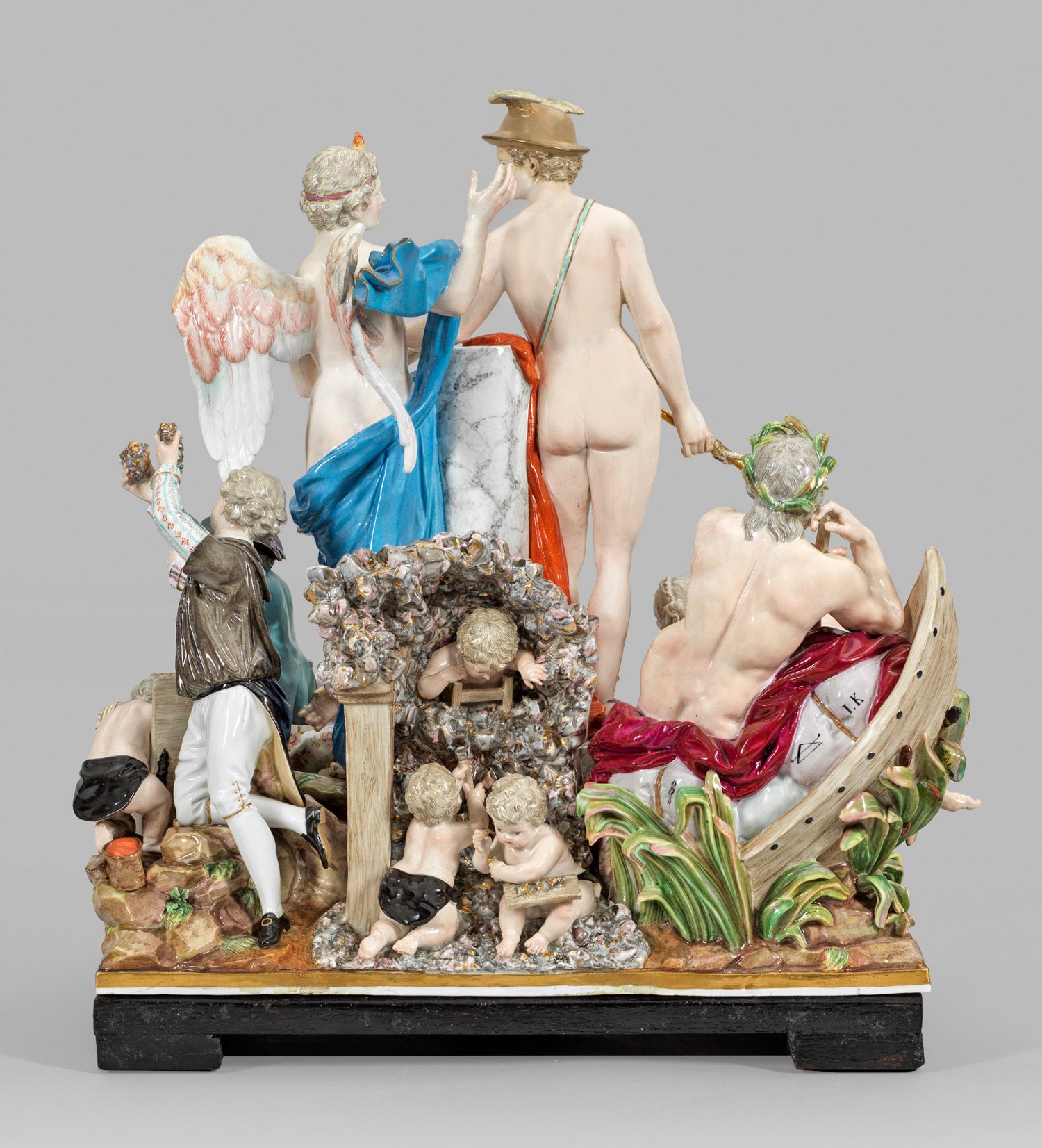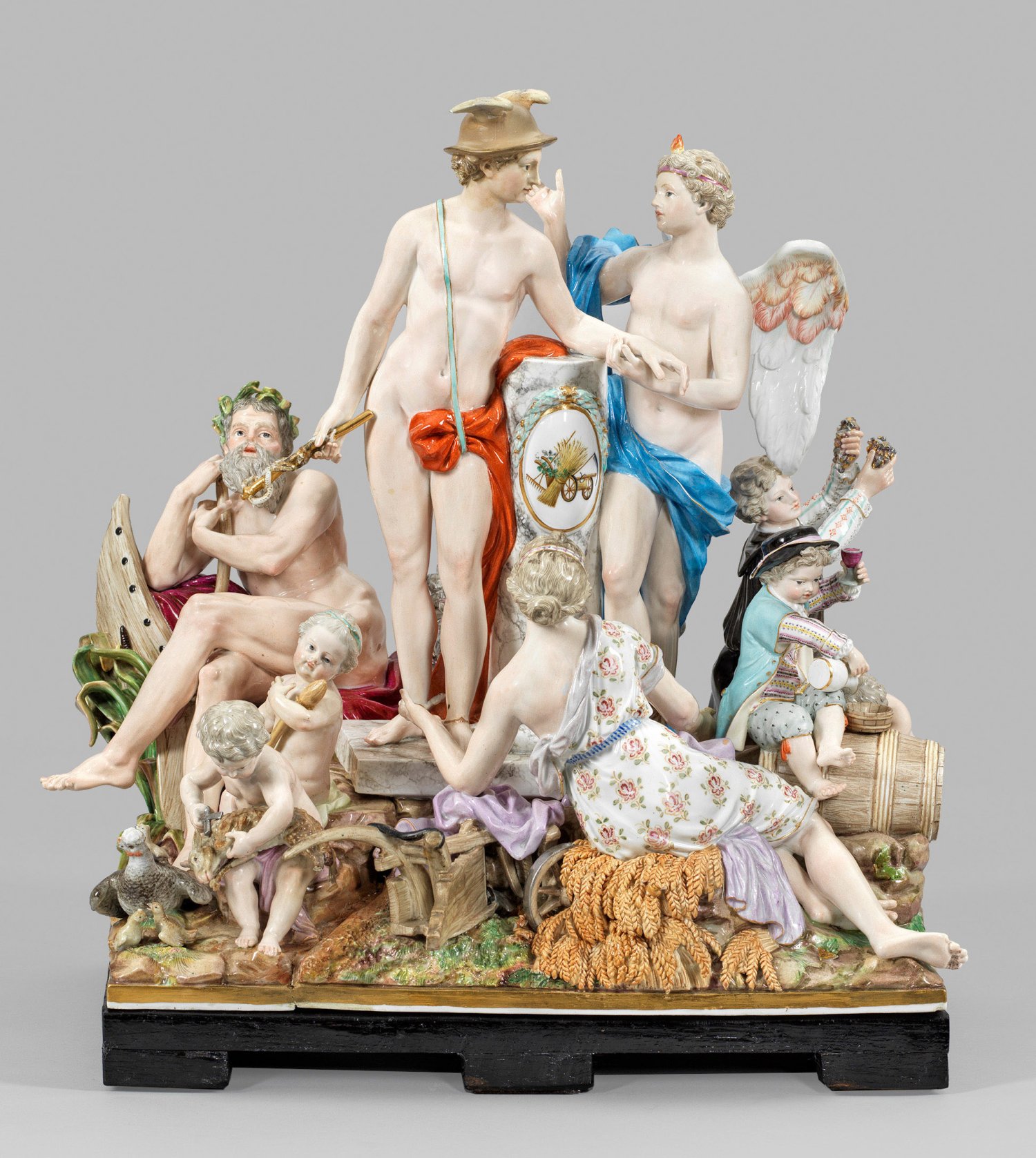 Auf geschwärztem Holzsockel mehrteilig montierte, allansichtige Komposition. Über felsigem Terrain zentrale Figurengruppe. An einer Marmorsäule stehender Merkur als Gott des Handels mit Flügelhelm und geflügelten Schuhen, in der rechten Hand einen goldenen Heroldstab haltend. Seitlich zu einem geflügelten Genius blickend. Um die Hauptgruppe verschiedene Figuren gruppiert. Schauseitig dargestellte, junge Frau, wohl Ceres, in antikisierendem Gewand in der Rückansicht, auf Ährenbündel sitzend, sich mit ihrem linken Arm auf den seitlich stehenden Pflug stützend. Zu ihrer Linken zwei sitzende Amoretten, ein Schaf scherend bzw. die Wolle spinnend als Repräsentation der Landwirtschaft. Unweit eine Hühnerfamilie. Im Hintergrund, an einem Schiffheck mit geschnürten Ballen sitzender Flussgott als Allegorie der Elbe. Rückseitig dargestellte Bergmannsputten im Erzstollen, beim Abbau von Silber und Gold sowie seitlicher Bergmannsknappe, daneben Winzerknabe mit Weinpokal und Kanne auf einem Weinfass sitzend. Polychrome Malerei mit reicher Goldstaffage. Entw. Michel Victor Acier, um 1775 - 1776. Partiell rest.; H. 44 cm. Ca. 41 cm x 33 cm.