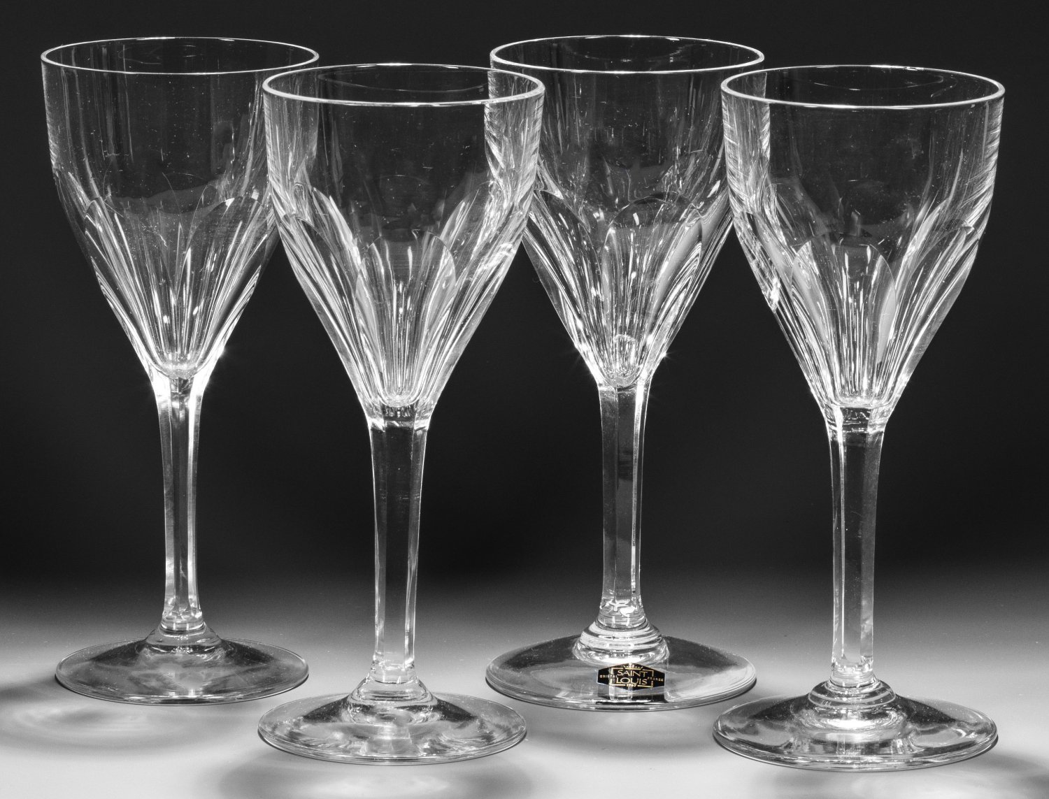 Four French Saint-Louis "Bristol" cut crystal red wine glasses. One glass with acid factory mark and factory label.