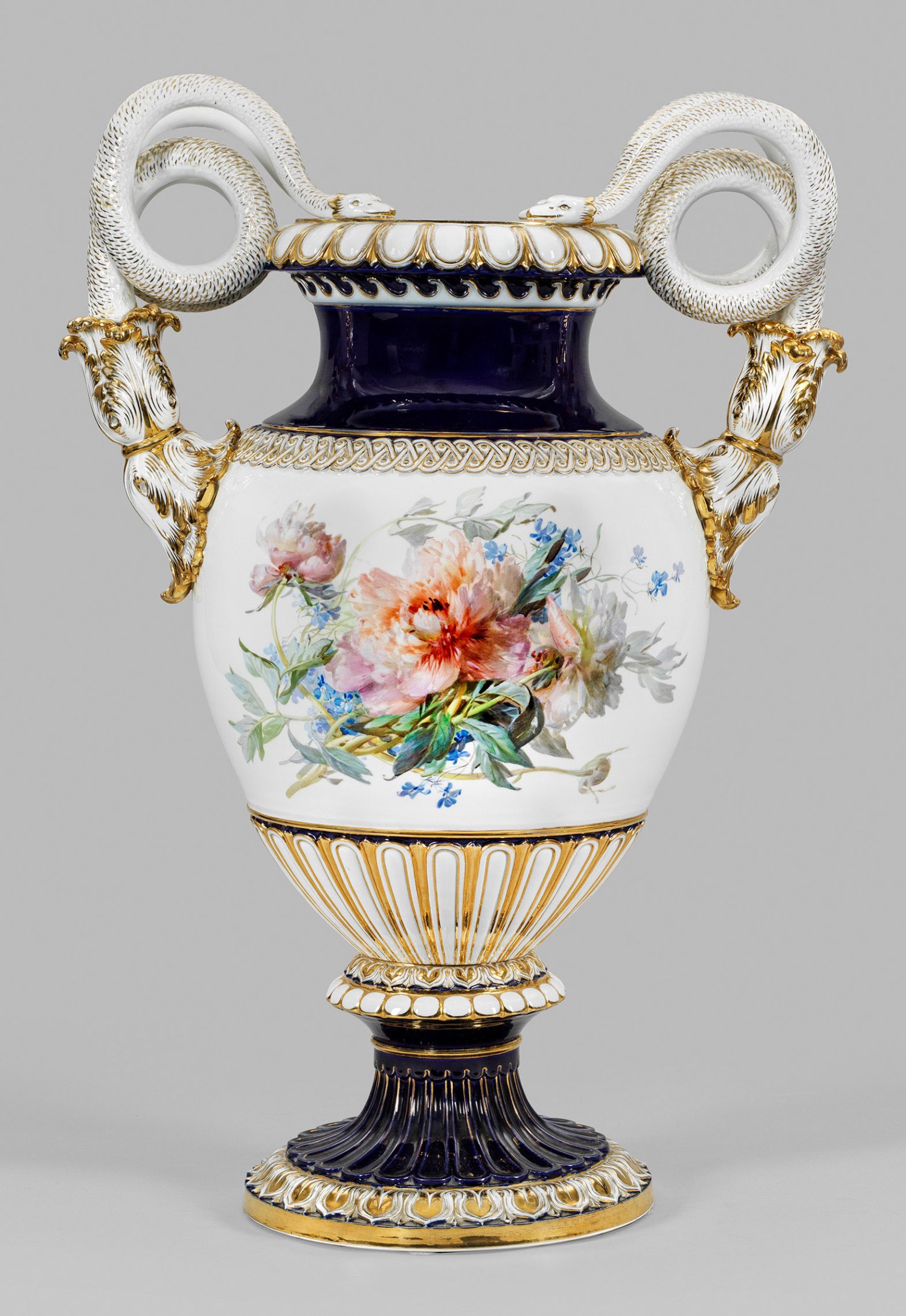 Über hochgezogenem Rundfuß mit Nodus ovoider Korpus mit eingezogenem Hals, in weit ausschwingenden Mündungsrand übergehend. Umlaufende ornamentale Reliefbordüren aus Eierstab, Zungenblatt sowie Wellen- und Flechtband, teilw. auf kobaltblauem Fond. Von der gerundeten Schulter ausgehend zwei, aus stark reliefplastischen Akanthusblättern aufsteigende, spiralförmig eingerollte Schlangenhenkel. Beidseitig der Wandung großflächig angelegte Darstellung "Les douceurs de l'été" ("Die Annehmlichkeiten des Sommers") nach Francois Boucher und Kupferstich von Pierre Etienne Moitte bzw. impressionistisch anmutendes Blumenarrangement aus Pfingstrosen. Virtuose weiche Malerei, ausgeführt von dem Meissener Figurenmaler Paul Voigt, tätig seit 1898 bzw. wohl Prof. Julius Eduard Braunsdorf oder Schüler. Reiche Goldstaffage. Entw. Ernst August Leuteritz. Im Boden bez. "Les douceurs de l'été nach Boucher./ Paul Voigt". Minim. best./ber.; Schwertermarke. H. 76 cm.