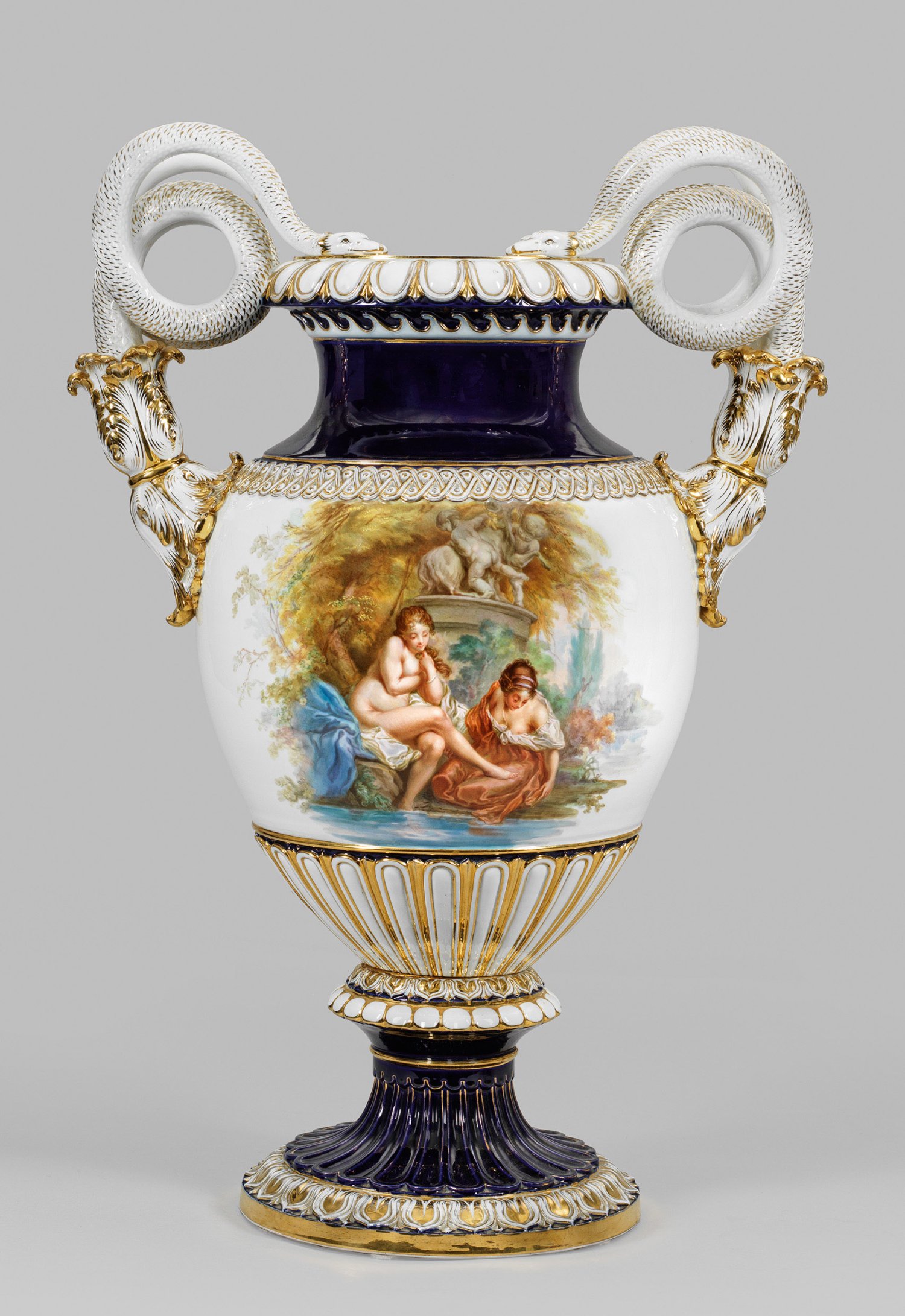 Lot 882: Monumentale Meissen Schlangenhenkelvase mit Boucher-Darstellung und Blumenmalerei