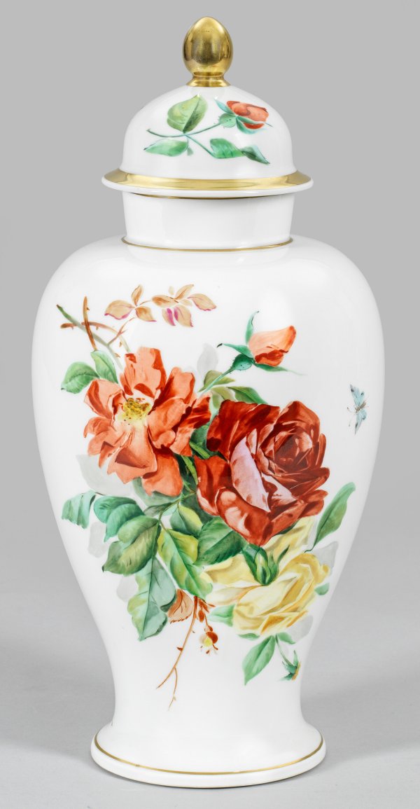 Über eingezogenem, rundem Stand balusterförmiger Korpus. Aufgewölbter Haubendeckel mit stilisiertem Pinienknauf. Schauseitig ein farbenprächtiges Gebinde aus roten und gelben Rosen. Die Rückseite sowie der Deckel mit Rosenzweig, umgeben von vereinzelten Schmetterlingen und Insekten. Polychrome Malerei mit Goldstaffage. Schwertermarke. H. 38 cm.
