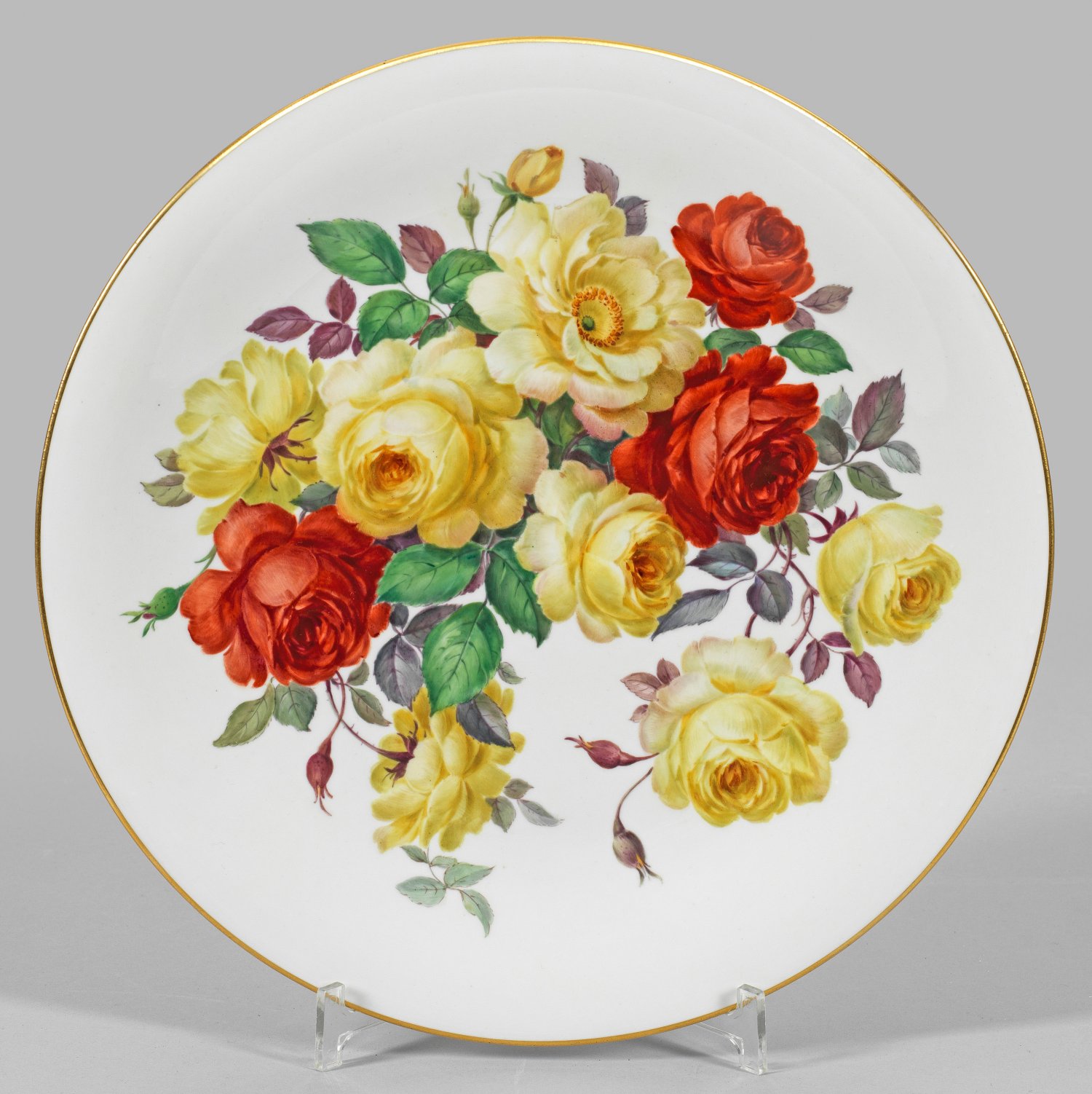Runde Form mit glattem Rand. Im flachen Spiegel großflächiges Bukett aus roten und gelben Rosen in polychromer Malerei. Goldrand. Rücks. Wandaufhängung. Schwertermarke. D. 36 cm.