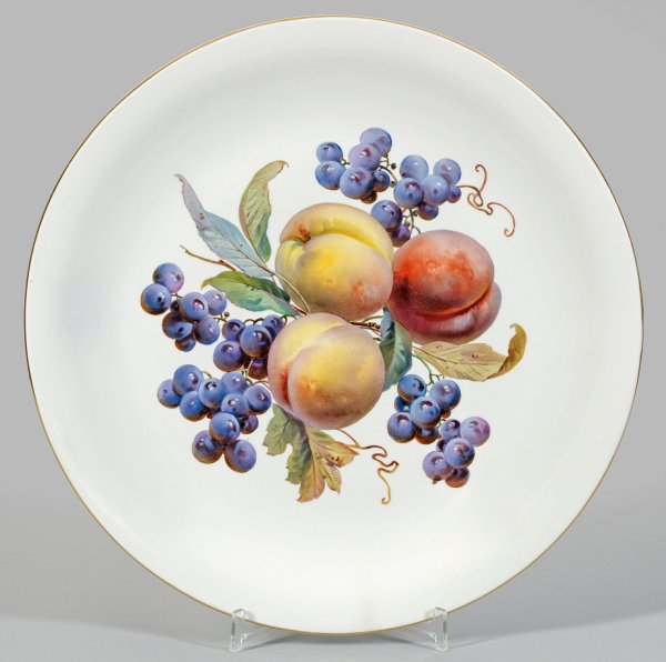 Runde, flach gemuldete Form mit glattem Rand. Im Spiegel großes Früchtebukett aus Pfirsichen und Trauben in äußerst weicher, polychromer Malerei mit feinem Pinselduktus. Goldrand. Schwertermarke. D. 45,5 cm.