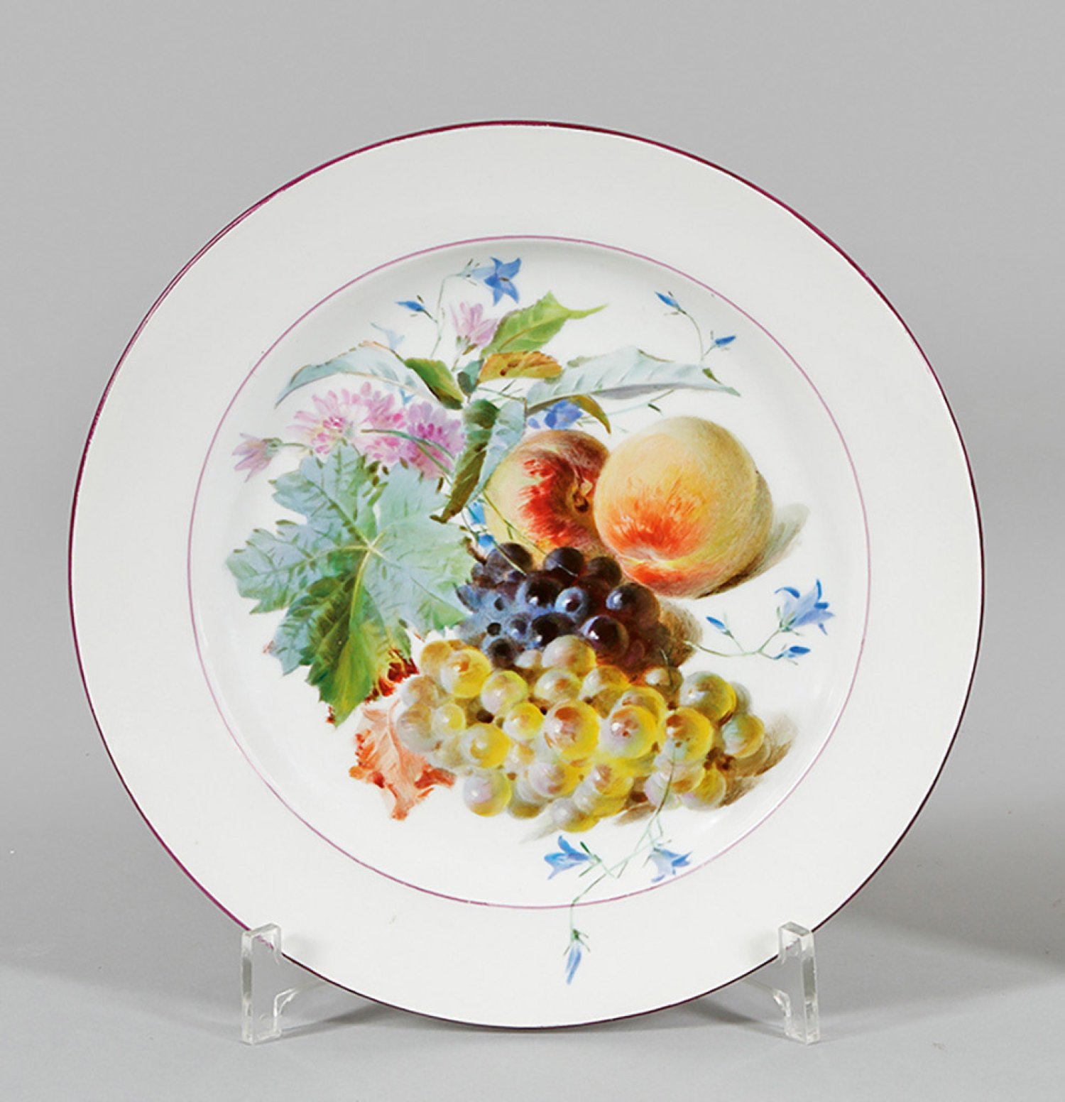 Runde Form mit glattem, purpurfarbenem Rand. Im vertieften Spiegel farbenfrohes Früchtebukett aus hellen und dunklen Trauben sowie Pfirsichen umgeben von Blütenranken. Feine polychrome Malerei wohl von Max Flath in der Art von Prof. Julius Eduard Braunsdorf. Rücks. Maler-Sign. und Dat. "M. Flath. 1922". Schwertermarke. D. 24 cm.
