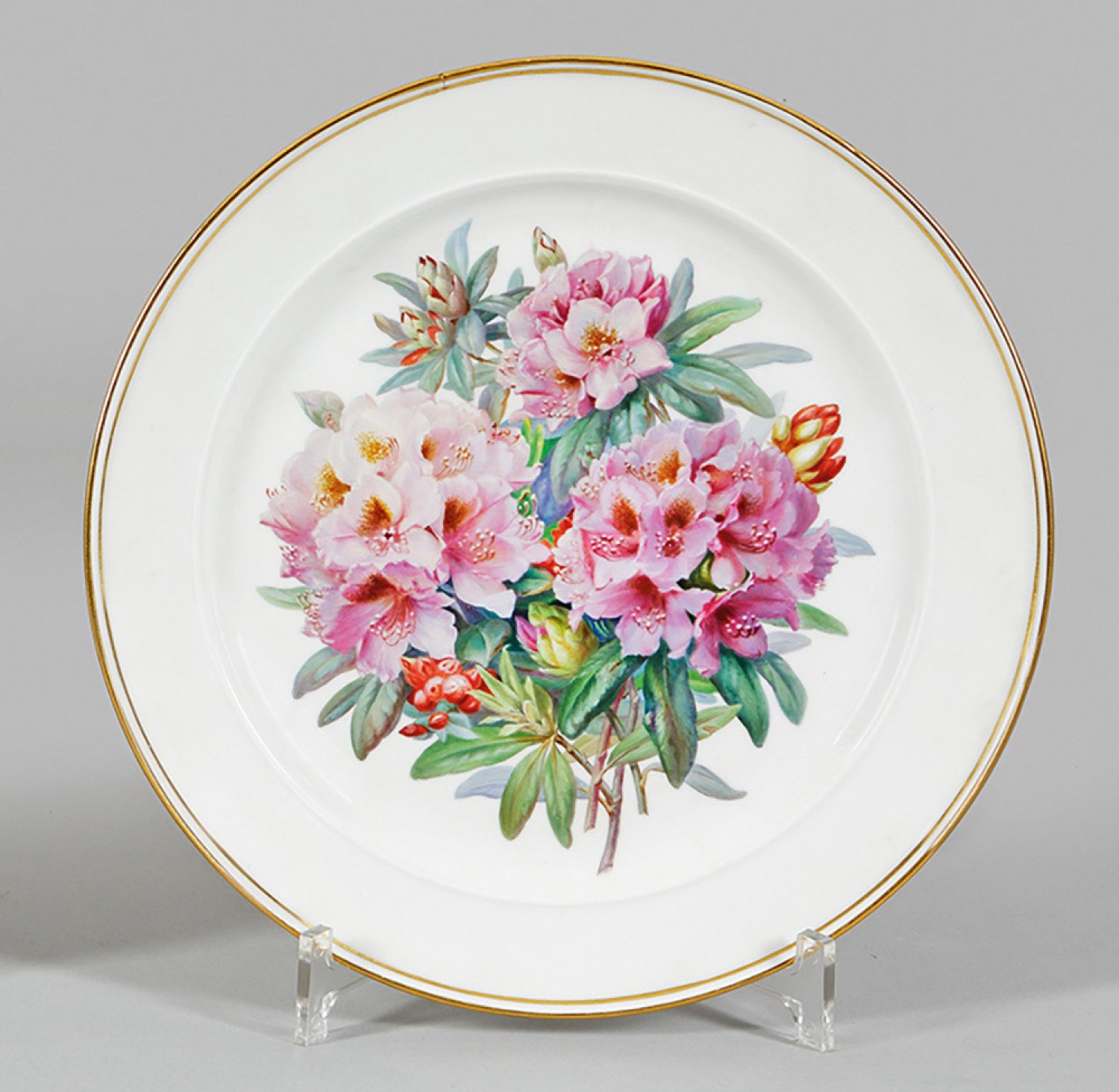 Runde Form mit glattem, profiliertem Goldrand. Im leicht vertieften Spiegel großes Arrangement aus blühendem Rhododendron in feiner polychromer Malerei. Produktionsbedingte Makel. Schwertermarke. D. 25,5 cm.