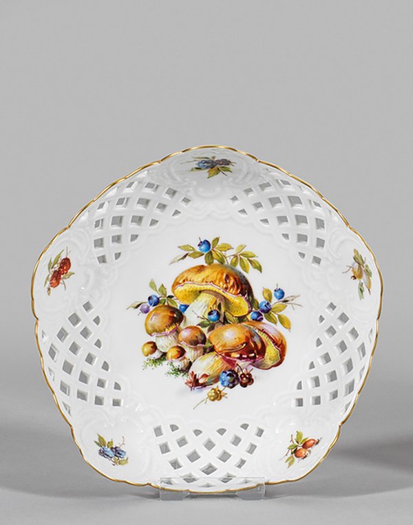 Runde Form. Korbgeflechtartig durchbrochen gearbeitete Wandung mit alternierend hochgezogenen, reliefierten Rocaillekartuschen, darin verschiedene Beerenzweige. Im Spiegel farbenprächtiges Arrangement aus Stachelbeeren, Steinpilzen, Brom- und Heidelbeeren. Feine polychrome Malerei in kräftigen Farben. Goldrand. Schwertermarke. D. 18,5 cm.