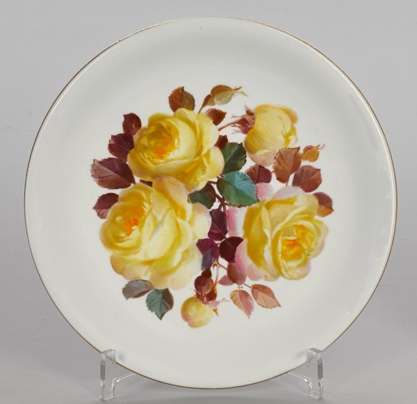 Runde Form mit glattem Goldrand. Im vertieften Spiegel farbenprächtiges Bukett aus gelben Rosenblüten in weicher, impressionistisch-duftiger Malerei. Minim. best.; Schwertermarke. D. 24 cm.