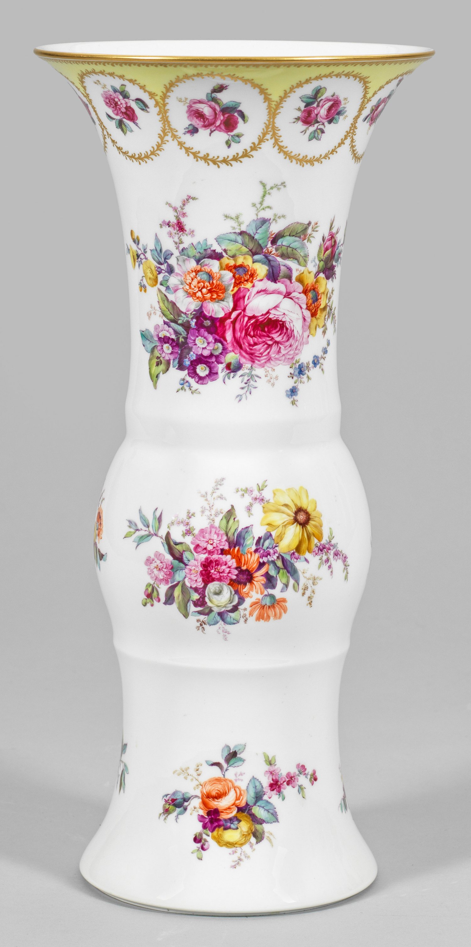 Flötenförmiger, mittig bauchig vorwölbender Korpus mit ausschwingendem Rand auf ausgestelltem Rundstand. Beidseitig der Wandung große, farbenprächtige Blumenarrangements, umgeben von kleinen Blumengebinden. Der Rand mit zitronengelbem Fond und umlaufenden, goldornamentiertem Medaillonband, darin kleine Rosenbuketts. Polychrome Malerei mit Golddekor. Malerzeichen. Jahresbuchstabe. Zepter- und Malereimarke. H. 45 cm.