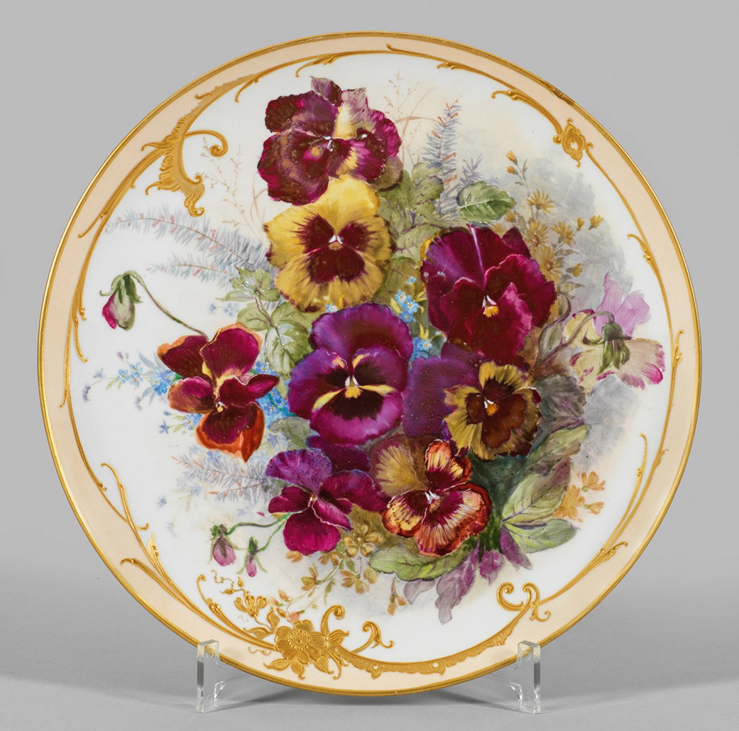 Runde, flach gemuldete Form mit glattem Rand. Im Spiegel großflächig angelegtes, impressionistisch anmutendes Arrangement aus verschiedenfarbigen Stiefmütterchen in farbenkräftiger, polychromer, weicher Malerei. Chamoisfarbener Fondrand, gerahmt von feinlinigem Reliefgoldranken und -blüten. Rücks. Maler-Sign. "Clos" (?) mit Dat. 1895. Montierungslöcher für Wandaufhängung. Zepter- und Malereimarke. D. 30 cm.