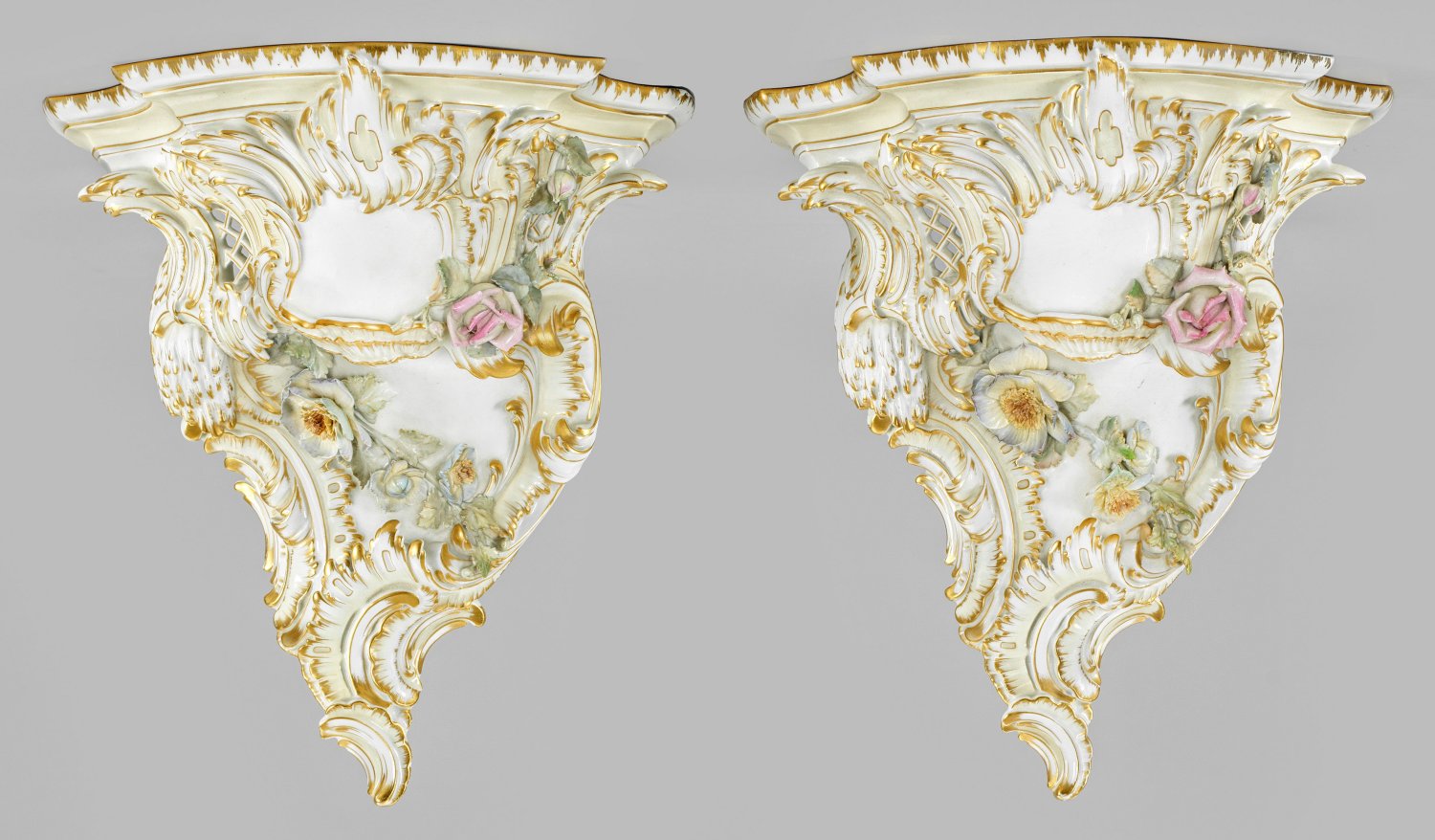 A pair of splendid Neorococo porcelain brackets with applied flower decor. Minor chipped/restored. Sceptre and painter's mark.