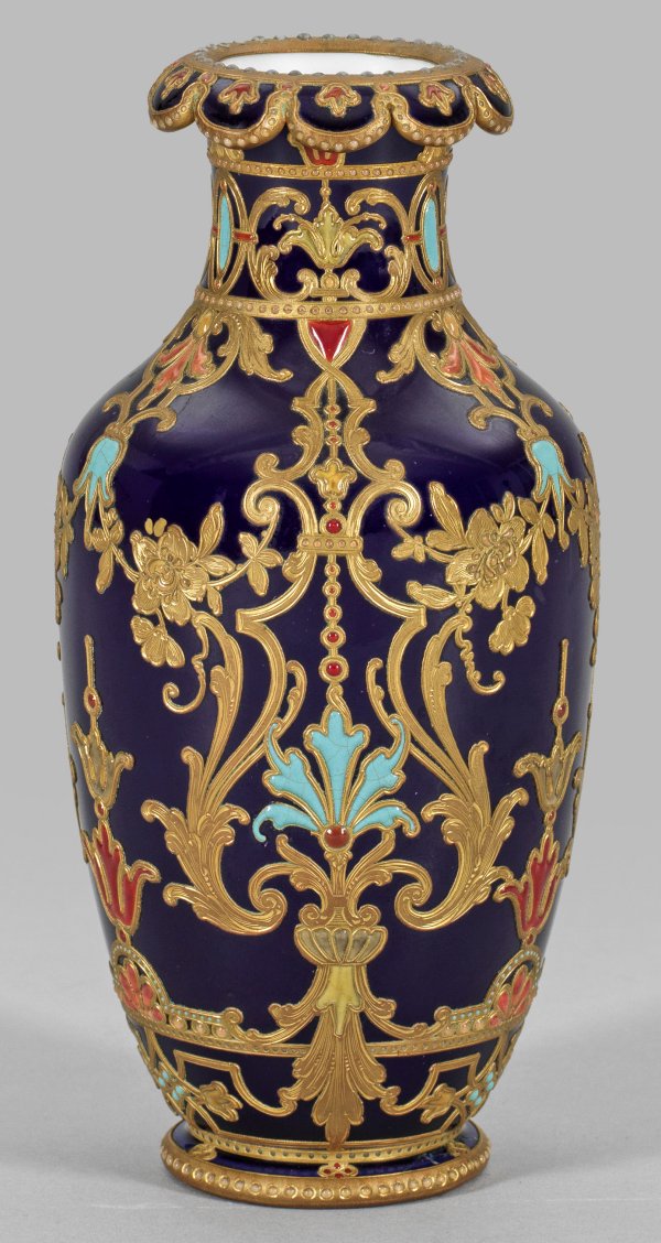 Balusterförmiger Korpus mit blütenförmig ausschwingender, passig geschweifter Mündung. Auf der Wandung umlaufender, sich wiederholender Dekor aus arabeskem Laub- und Rankenwerk in galvanischer, fein ziselierter Bronzeauflage auf kobaltblauem Fond, akzenturiert durch türkis- und framboisefarbenes sowie gelbes, erhabenes Schmelzemail. Minim. besch.; Zepter- und Malereimarke. H. 17 cm.