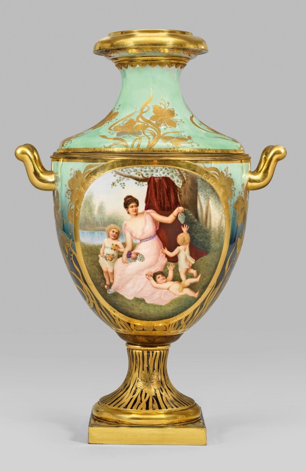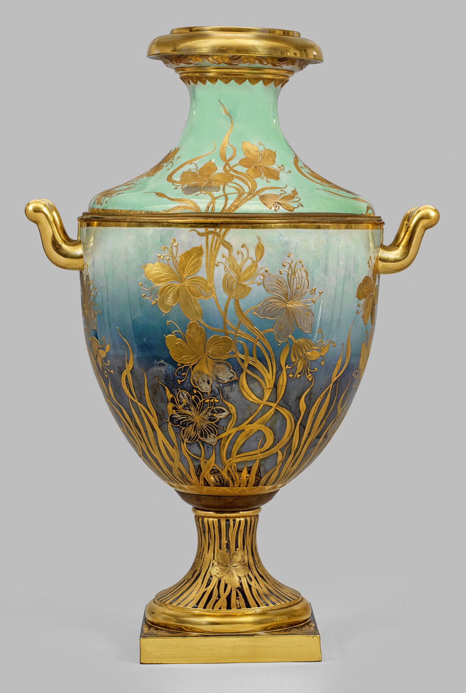 Form, sog. Münchener Vase. Über quadratischer Plinthe und konkav einschwingendem Rundfuß ovoider Korpus mit abgesetzter Schulter, in eingezogenen Hals mit ausladendem, profiliertem Mündungsrand übergehend. Seitlich hochgezogene, profilierte Handhaben. Auf der Wandung großflächig angelegter, stilisierter Jugendstil-Liliendekor in Reliefgold auf flächendeckendem, irisierendem Farbfond im Verlauf von Seladongrün zu Kobaltblau. Auf der Schauseite goldkonturierte Reserve mit Darstellung einer jungen, mit drei Kindern am Ufer sitzenden, jungen Frau in sommerlicher Landschaft. Äußerst feine, polychrome Malerei und reicher Reliefgolddekor. Sign. "Wagner". Im Boden bez. "Abundantia". Zeptermarke und Bindenschildmarke des Dekorateurs. H. 77 cm.