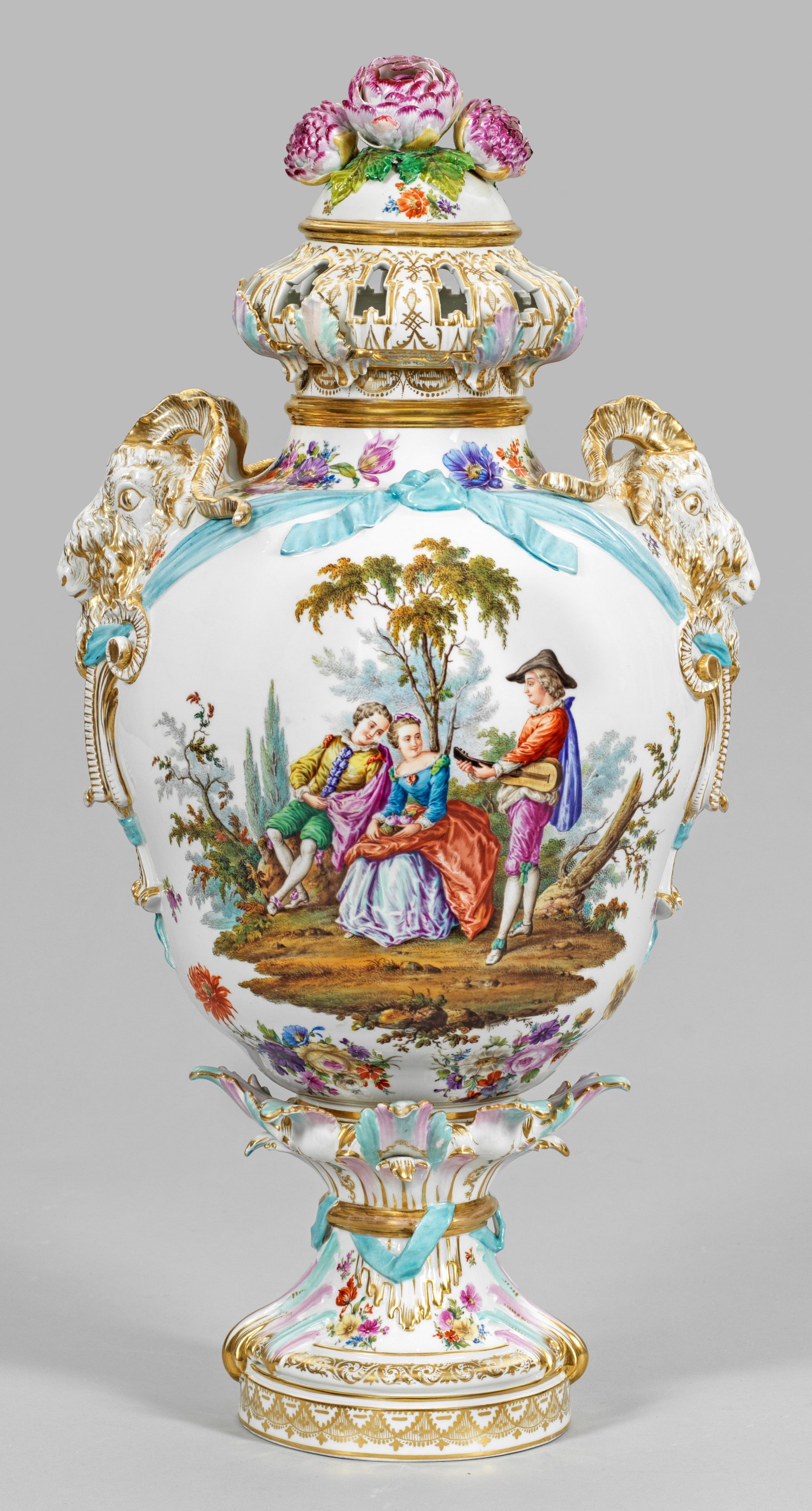 Über hochgezogenem Rundfuß balusterförmiger, mittig leicht eingezogener Korpus, umzogen von hellblauer, reliefierter Bandschleife. Seitlich große, plastische Widderköpfe. Durchbrochen gearbeiteter Haubendeckel, mittig feinplastischer Rosenblütenknauf. Beidseitig szenische Darstellung einer Rokoko-Gesellschaft in baumbestandener Parklandschaft nach Jean-Antoine Watteau, umgeben von farbenprächtigen Blumengebinden. Polychrome Malerei. Umlaufende Goldornamentbordüren und reiche Goldstaffage. Partiell rest.; Unw. best.; Zeptermarke. H. 64 cm.