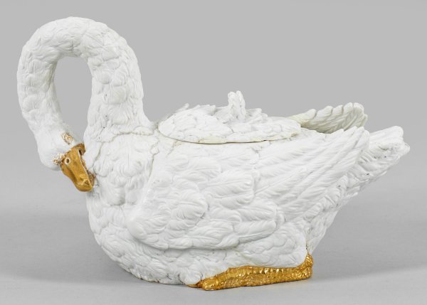 Biskuitporzellan. Vollplastisch gestalteter, sitzender Höckerschwan mit reliefiertem Federkleid und gebogtem Hals, verwendbar als Dose oder kleine Terrine. Schnabel und Beine goldstaffiert. Goldakzentuierungen an Augen und Höcker. Oberhalb ovoide Öffnung mit korrespondierendem Deckel. Entw. Johann Joachim Kaendler. Partiell rest.; Minim. best.; Teilw. verfüllte Brandrisse. Schwertermarke. H. 15,5 cm. L. 23 cm.