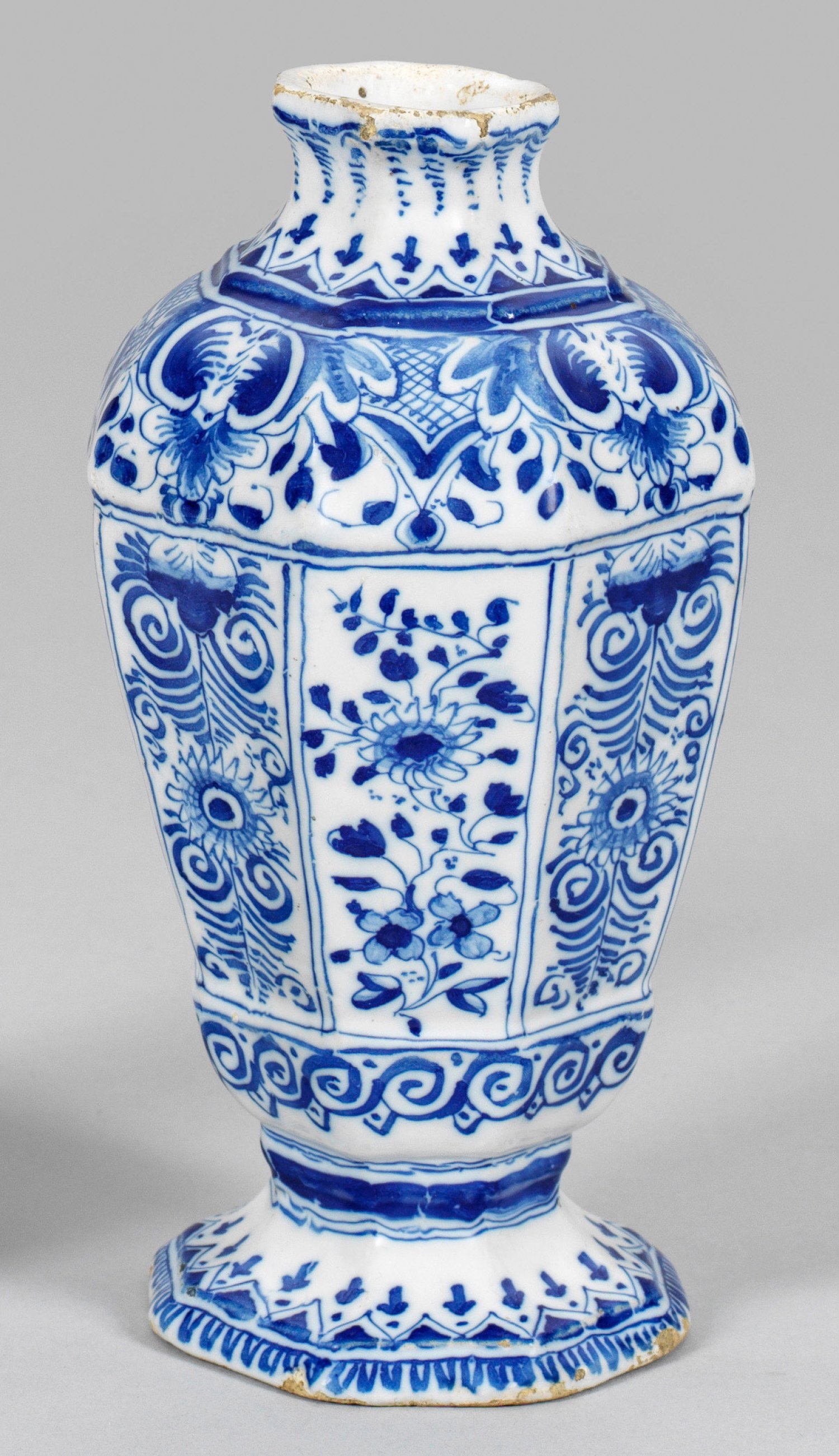 Fayence. Achteckige Balusterform mit ausgestelltem Fuß, die gerundete Schulter in kurzem Hals mit auslippender Mündung einschwingend. Reicher, kobaltblauer Scharffeuerdekor, die Felder des Korpus alternierend mit zwei unterschiedlichen floralen Motiven. Ger. best.; Undeutl. Monogramm als Manufaktur- oder Malermarke in Blau. H. 19 cm.
