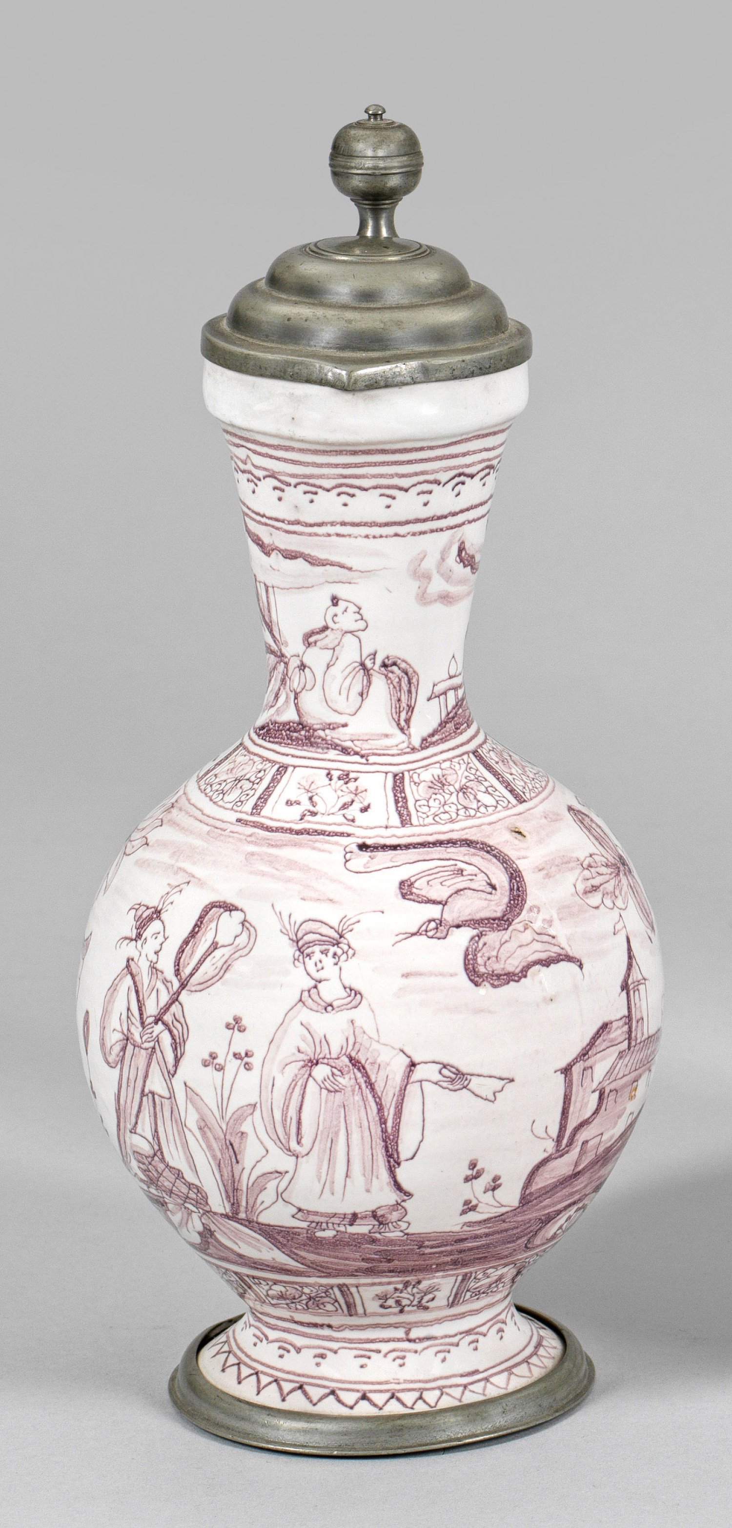 Fayence. Reicher, flächendeckender, manganvioletter Dekor aus Chinoiserien mit Figuren in fantasievoller Landschaft. Lippenrand minim. best.; Zinnmontierter Fuß, der abgetreppte Deckel mit Kugeldrücker. H. 26,5 cm.