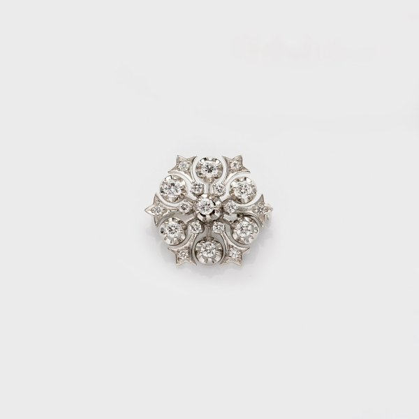 Weißgold, gest. 585. Besetzt mit Brillanten von zus. ca. 1,10 ct. (vvsi/w), blütenförmig gefasst. Gew. ca. 7,10 g.